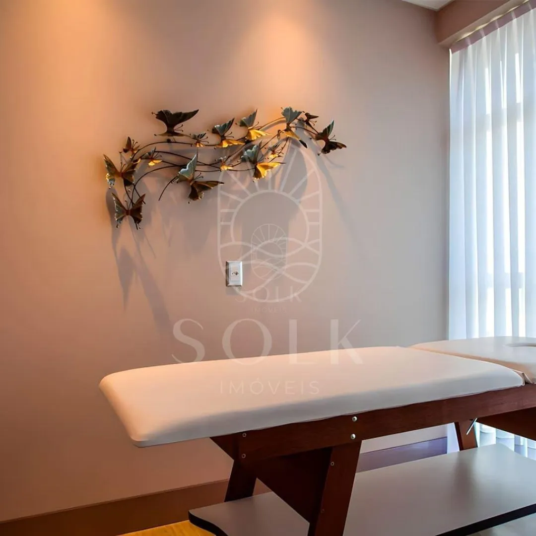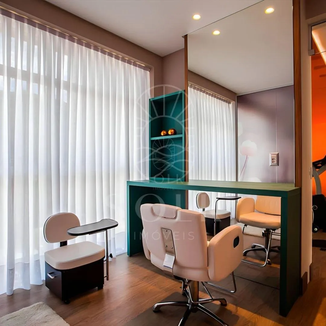 A área de lazer foi pensada para atender diferentes perfis dentro do mesmo núcleo familiar, com mais de 15 ambientes mobiliados e climatizados. Entre eles, piscina adulto e infantil, spa com hidromassagem, sauna, espaço fitness, salão de festas, espaço gourmet, sala de jogos e cinema privativo. A presença de brinquedoteca, praça do fogo, quiosque com churrasqueira a carvão e salão de beleza complementa a estrutura de uso contínuo.