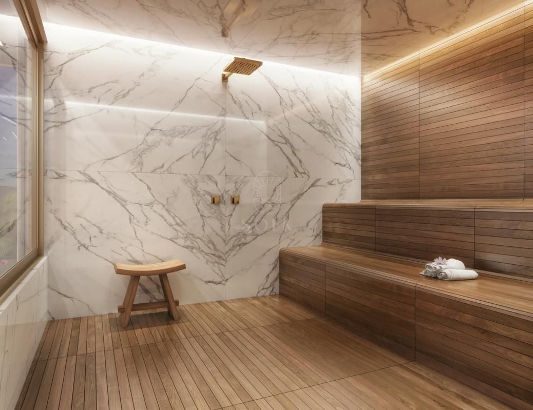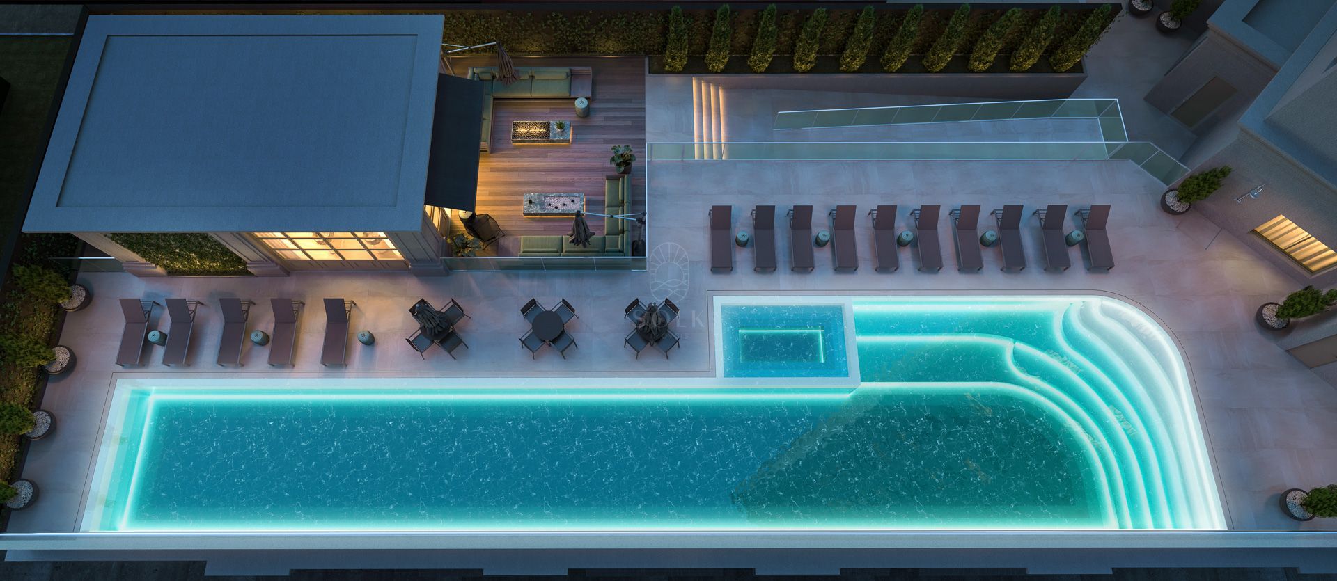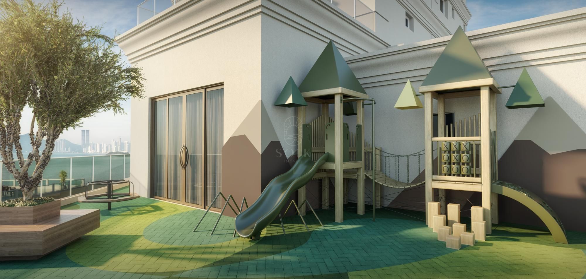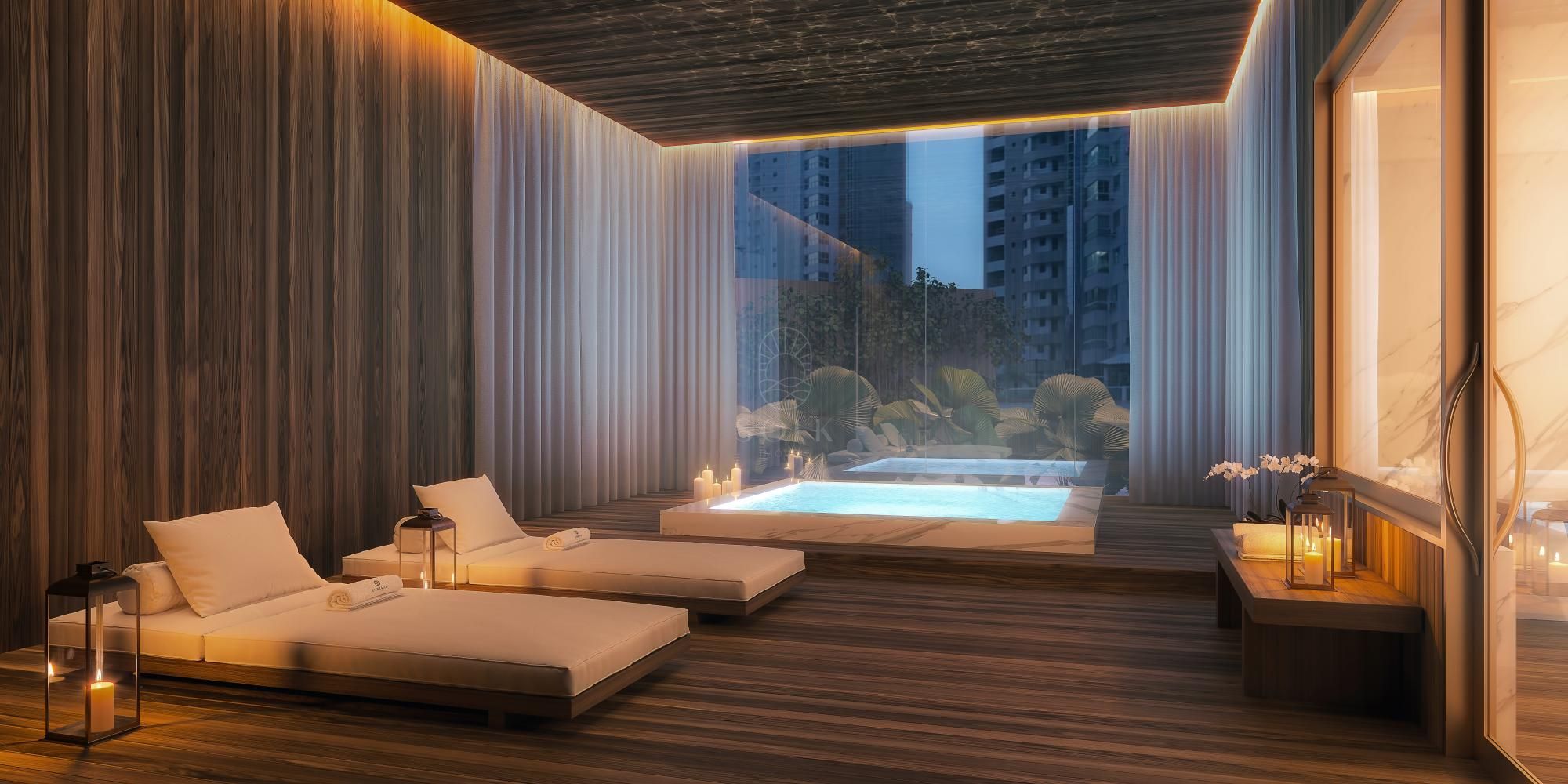 A área de lazer possui cerca de 1.000 m² distribuídos em ambientes como piscina com raia de 24 metros, hidromassagem externa, spa com hidromassagem, sauna úmida, sala de massagem, academia, salão de festas, espaço grill com churrasqueira a carvão, brinquedoteca, playground e outdoor lounge. Os espaços são entregues equipados e decorados.