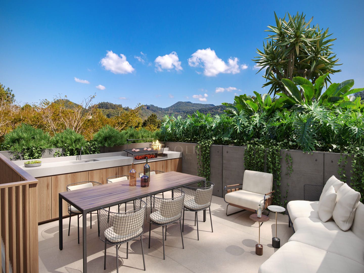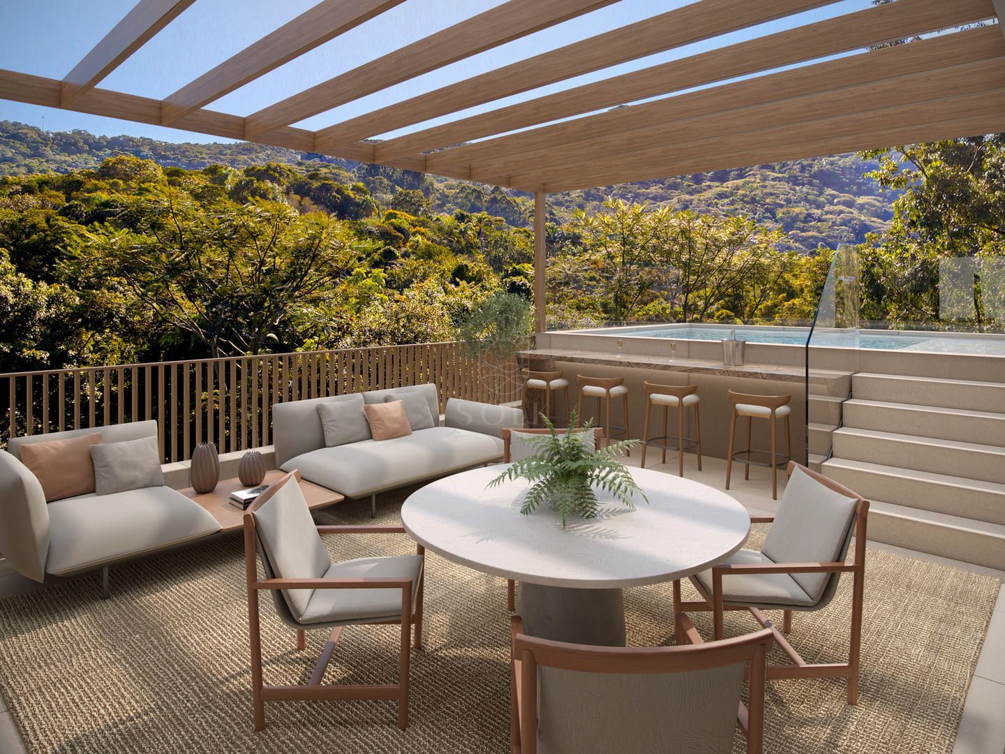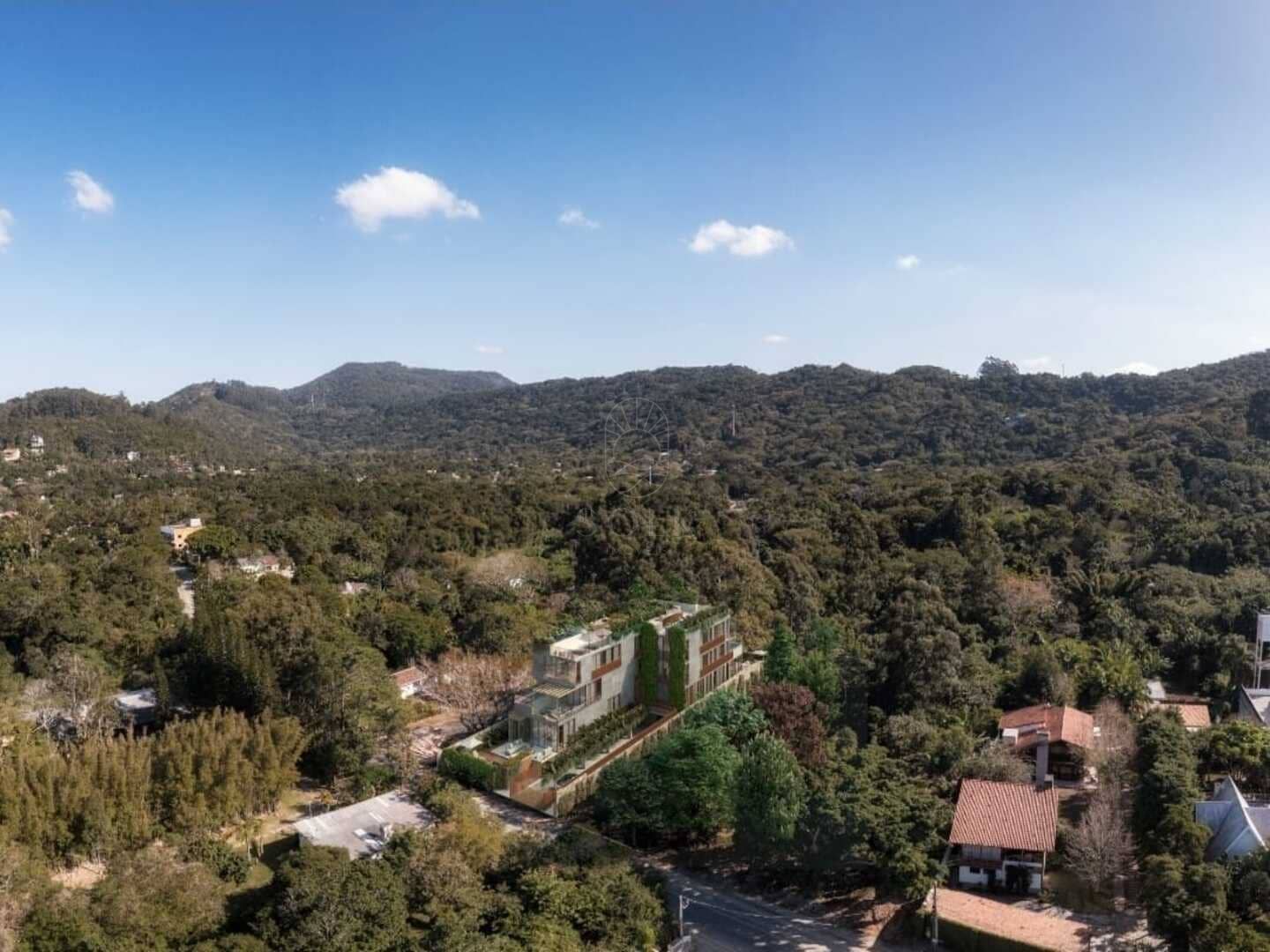 Sua arquitetura adota linhas puras e materiais naturais que dialogam com a mata e o mar. Cada terraza conta com piscina aquecida exclusiva, e as unidades superiores oferecem rooftops privativos. O empreendimento inclui garagem com três vagas e box privativo, além de pontos para abastecimento de carros elétricos.