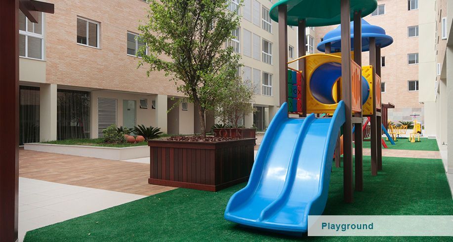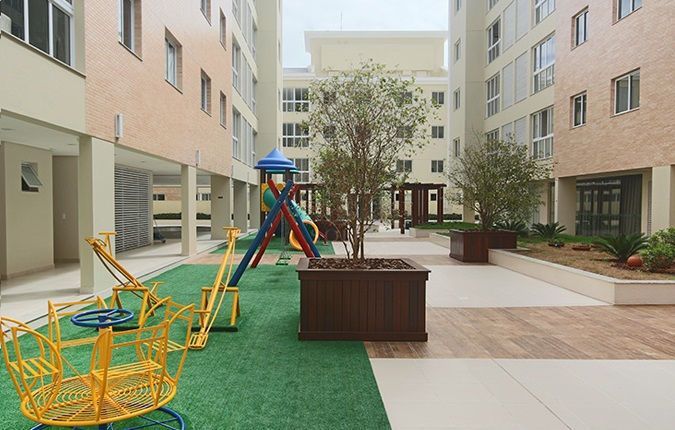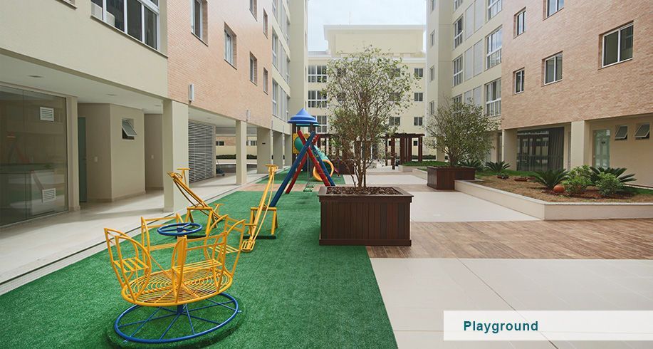 A área de lazer acompanha essa proposta, oferecendo piscina, academia, salão de festas, playground, sauna, mini quadra poliesportiva e espaços de convivência distribuídos ao longo do condomínio. A presença de áreas abertas e alamedas internas reforça a leitura de condomínio multiuso, com dinâmica mais próxima a um clube residencial.