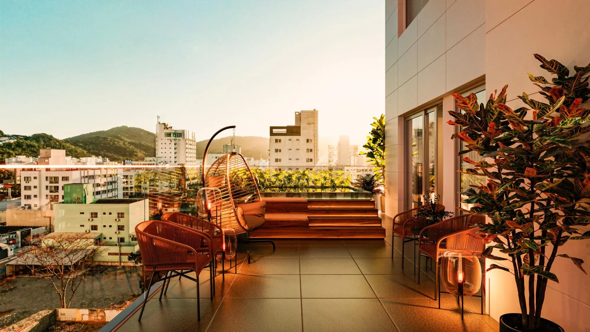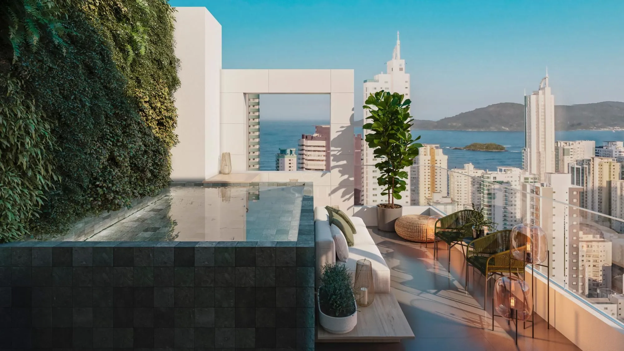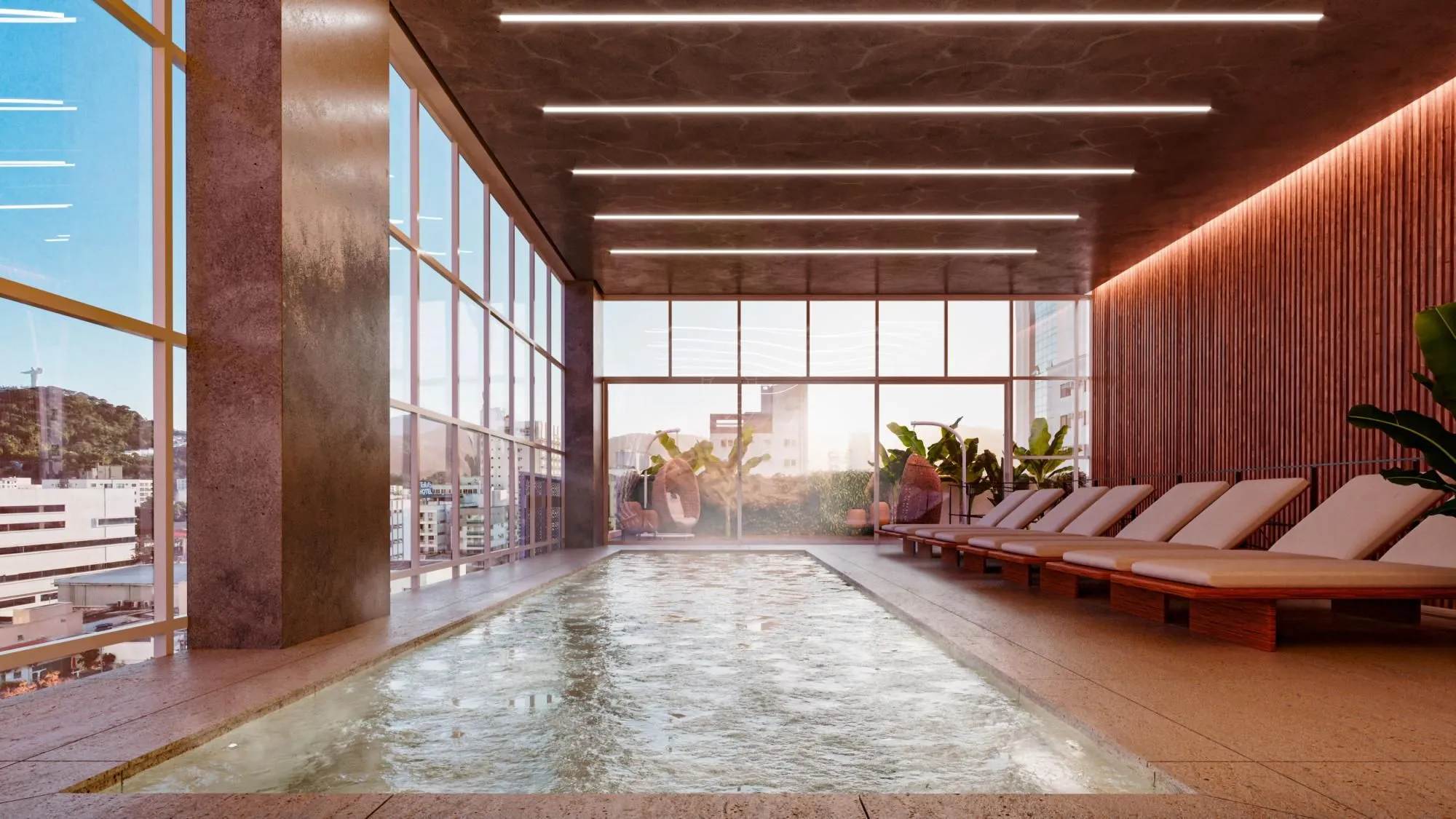 O empreendimento conta com piscinas adulto e infantil, piscina térmica e bar molhado, criando uma área externa voltada ao relaxamento e ao convívio social, além de sauna e espaço zen, que reforçam a proposta de bem-estar.