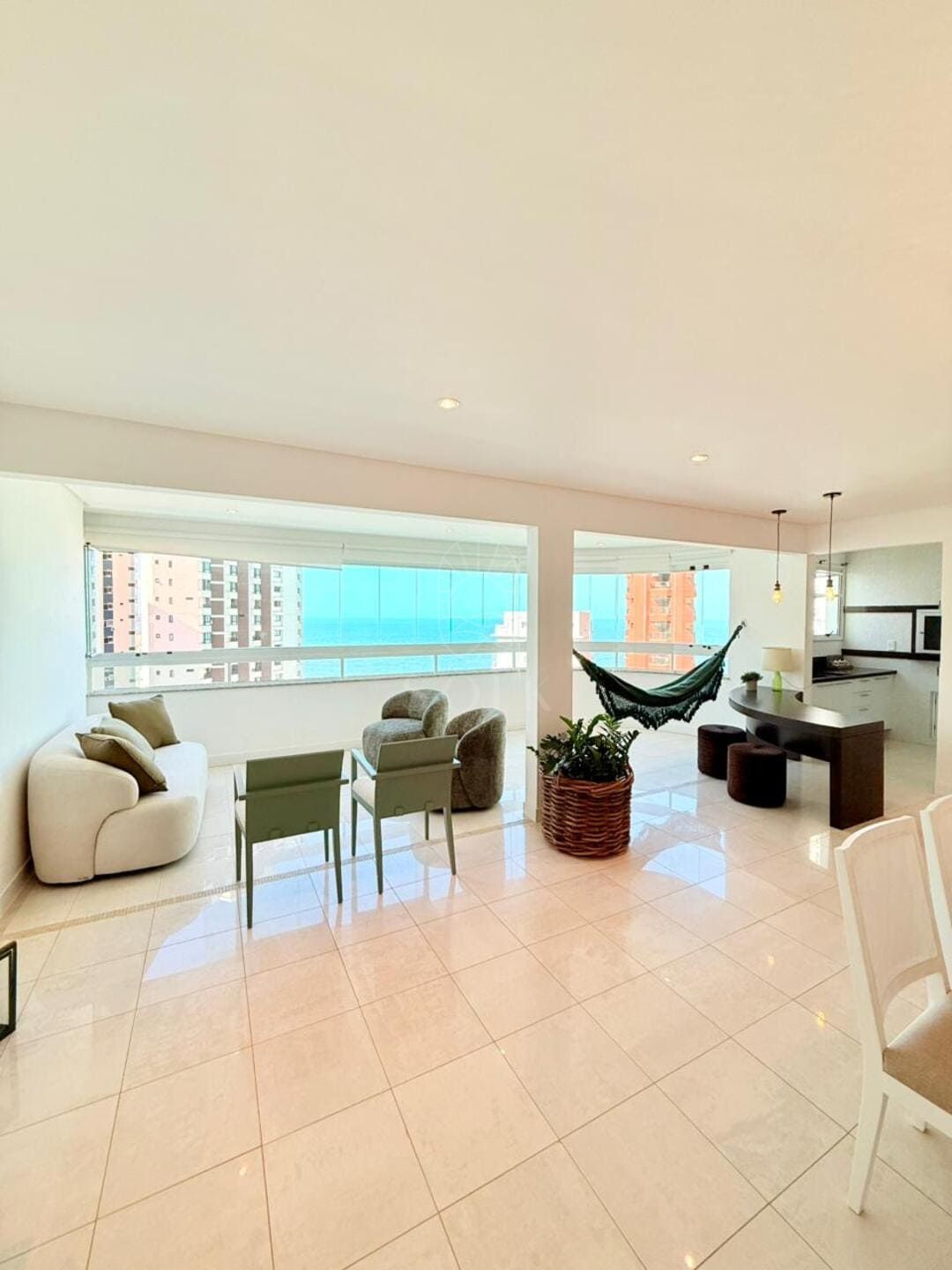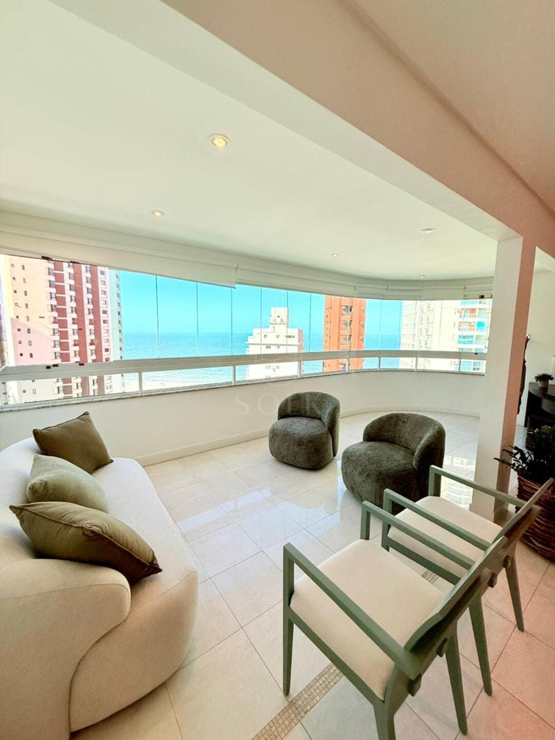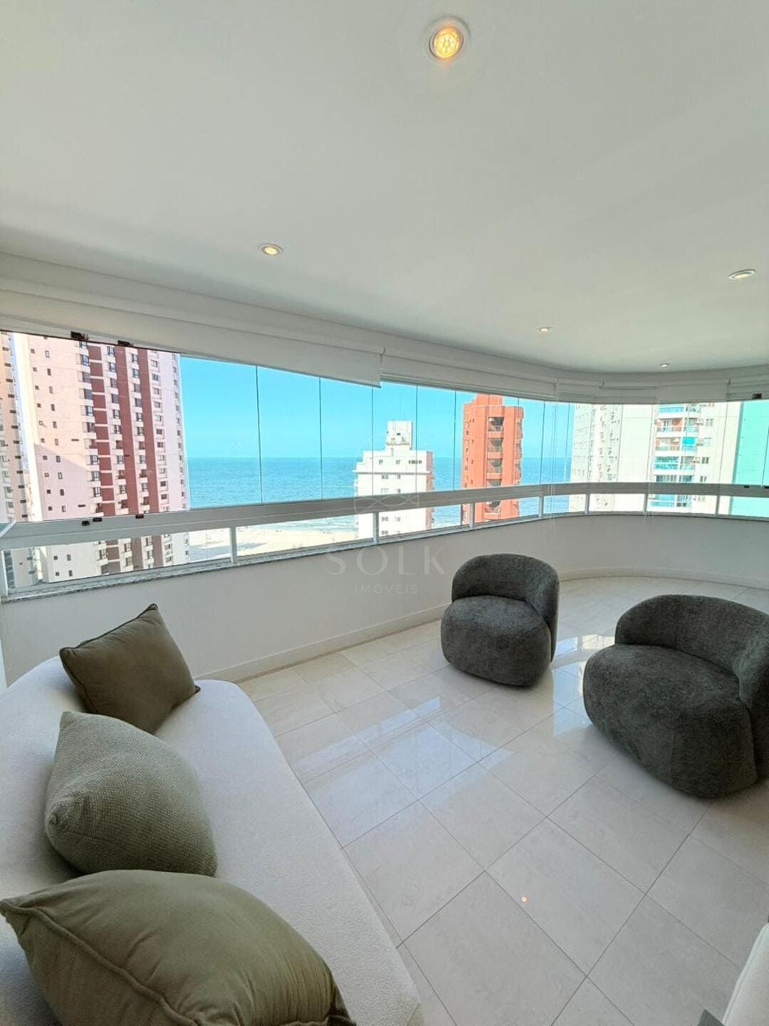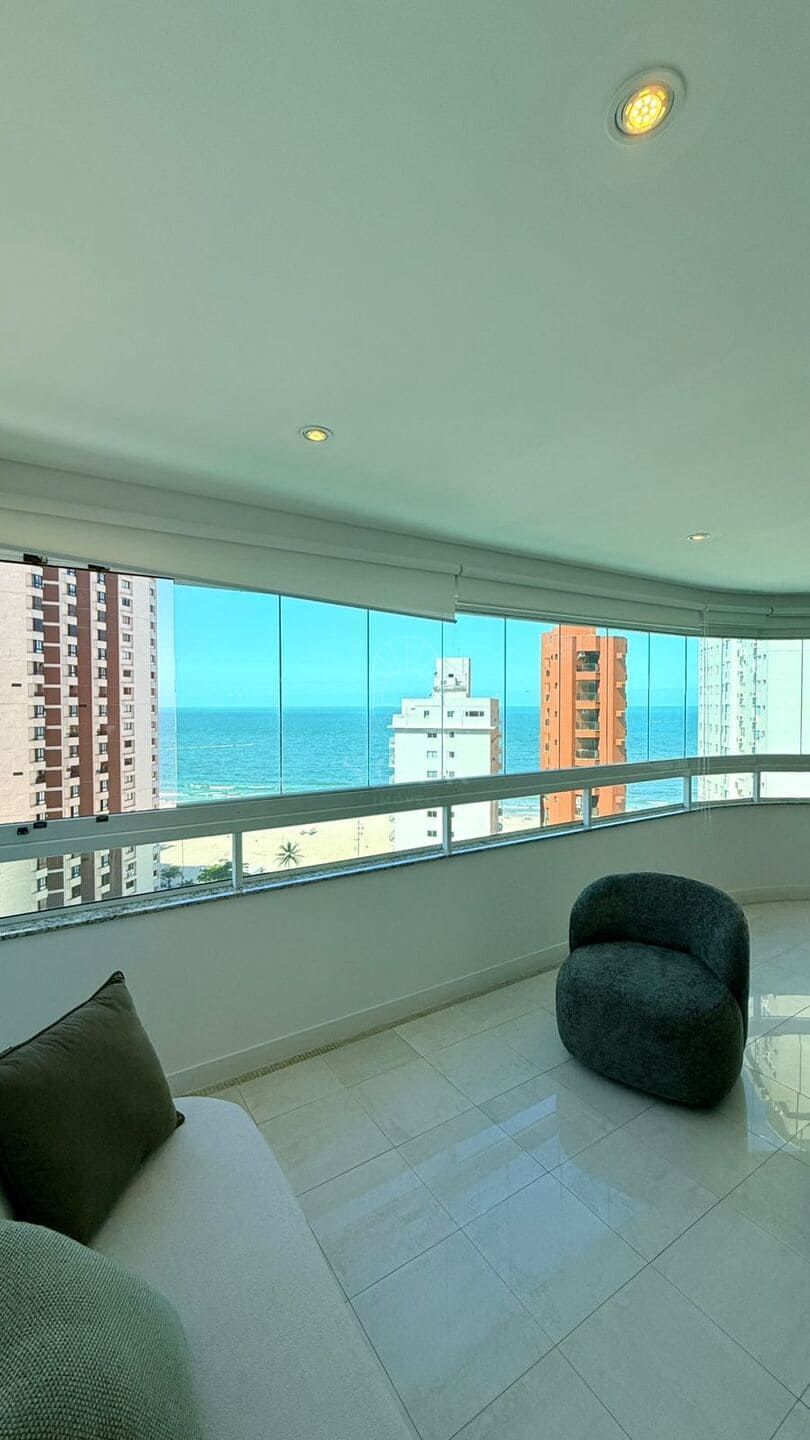A vista para o mar surge como pano de fundo constante, trazendo leveza visual e ampliando a percepção espacial do apartamento. O imóvel é semi mobiliado, com marcenaria e elementos já definidos que reduzem o tempo entre a compra e a ocupação, sem limitar futuras escolhas. O lavabo complementa a área social com discrição e utilidade, enquanto as três vagas de garagem reforçam a praticidade para quem vive ou recebe com frequência.