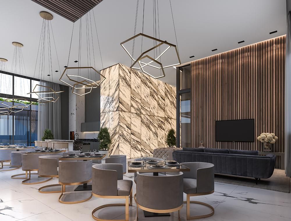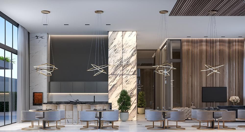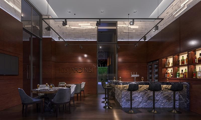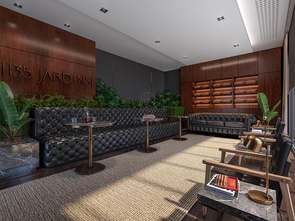 No lazer social, o 135 Jardins oferece salão de festas, espaço gourmet com churrasqueira, pub, bar, lounge, sala de jogos, espaço garden e adega com charutaria, criando ambientes diversificados para convivência e entretenimento.