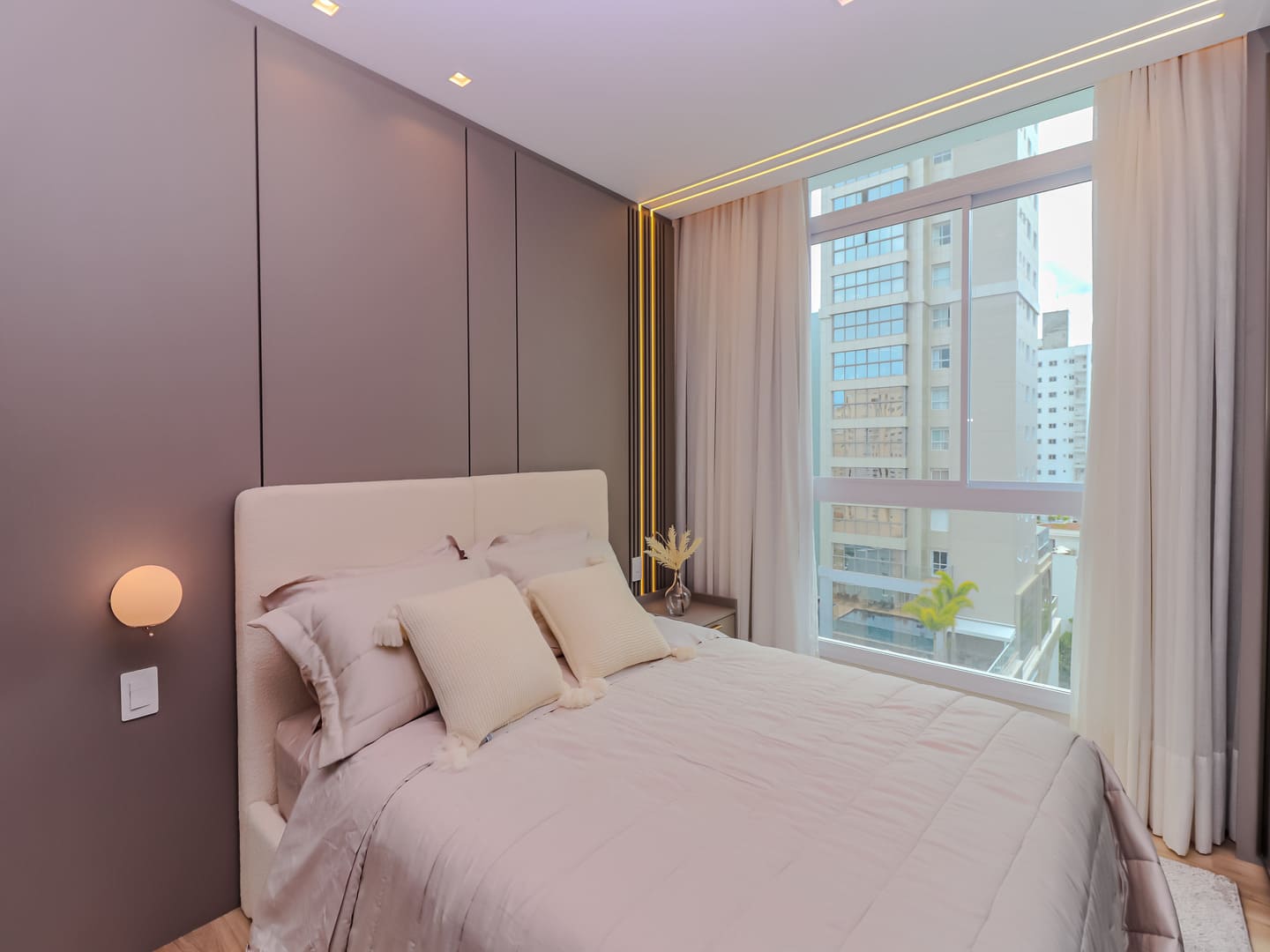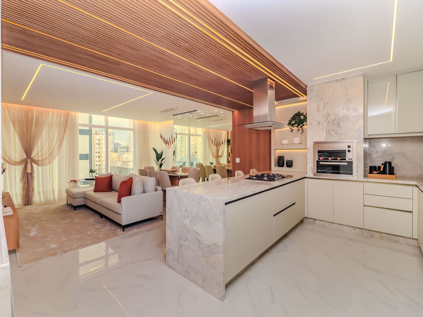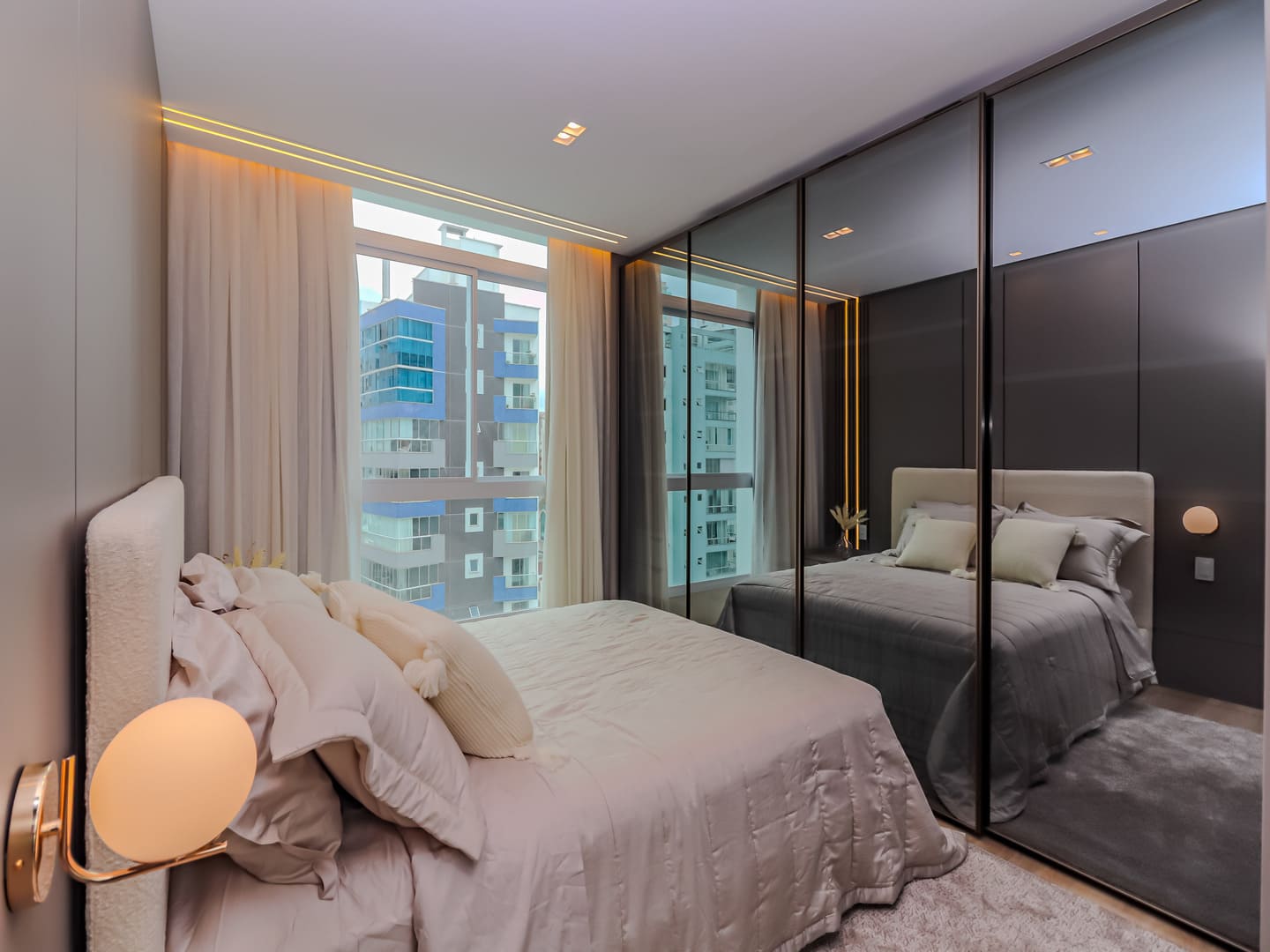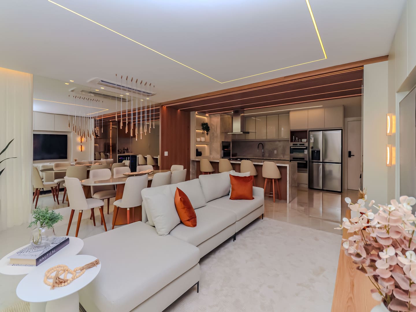 No Edifício Horizon Residence, encontra-se um apartamento mobiliado de 142 m² de área privativa, que revela a maturidade de um projeto arquitetônico atento às necessidades reais do morador. São duas suítes bem distribuídas, dois dormitórios, três vagas de garagem e uma planta inteligente que privilegia amplitude, iluminação natural e circulação fluida. Os acabamentos são de alto padrão, há infraestrutura para automação, churrasqueira americana e forro de gesso em todos os ambientes — detalhes que, combinados, imprimem sofisticação sem excessos.