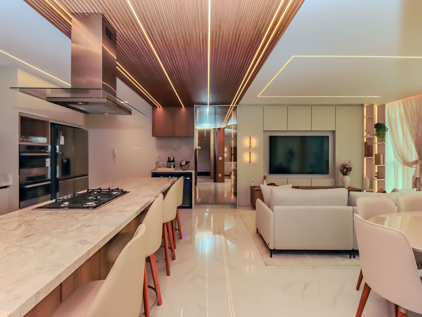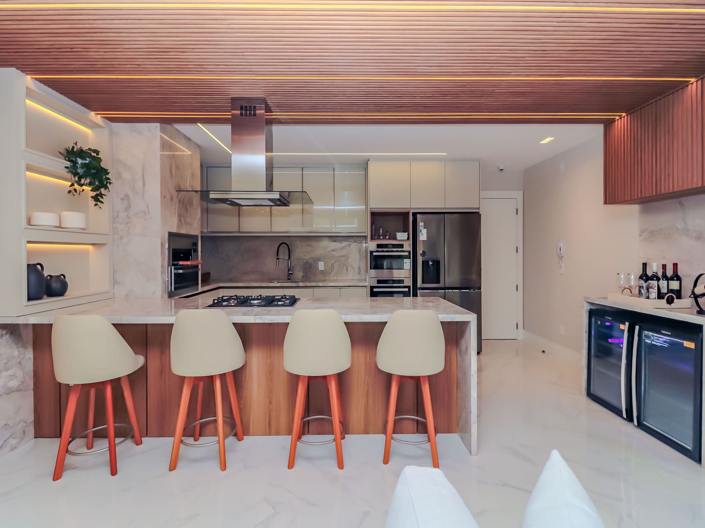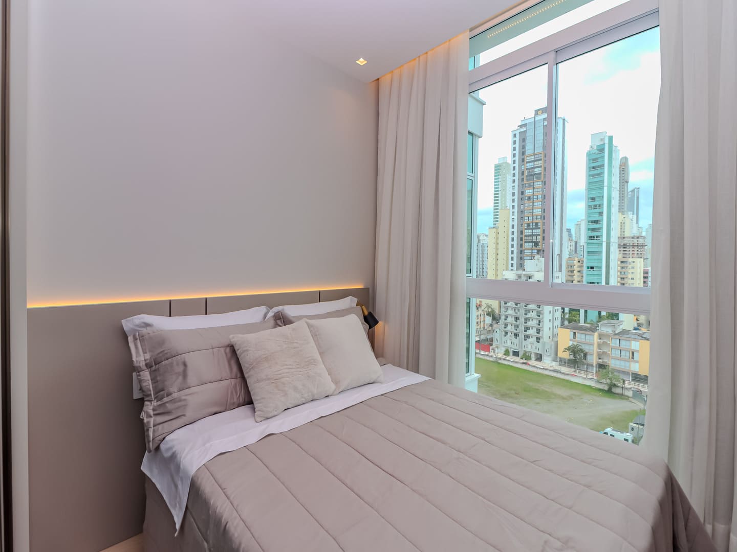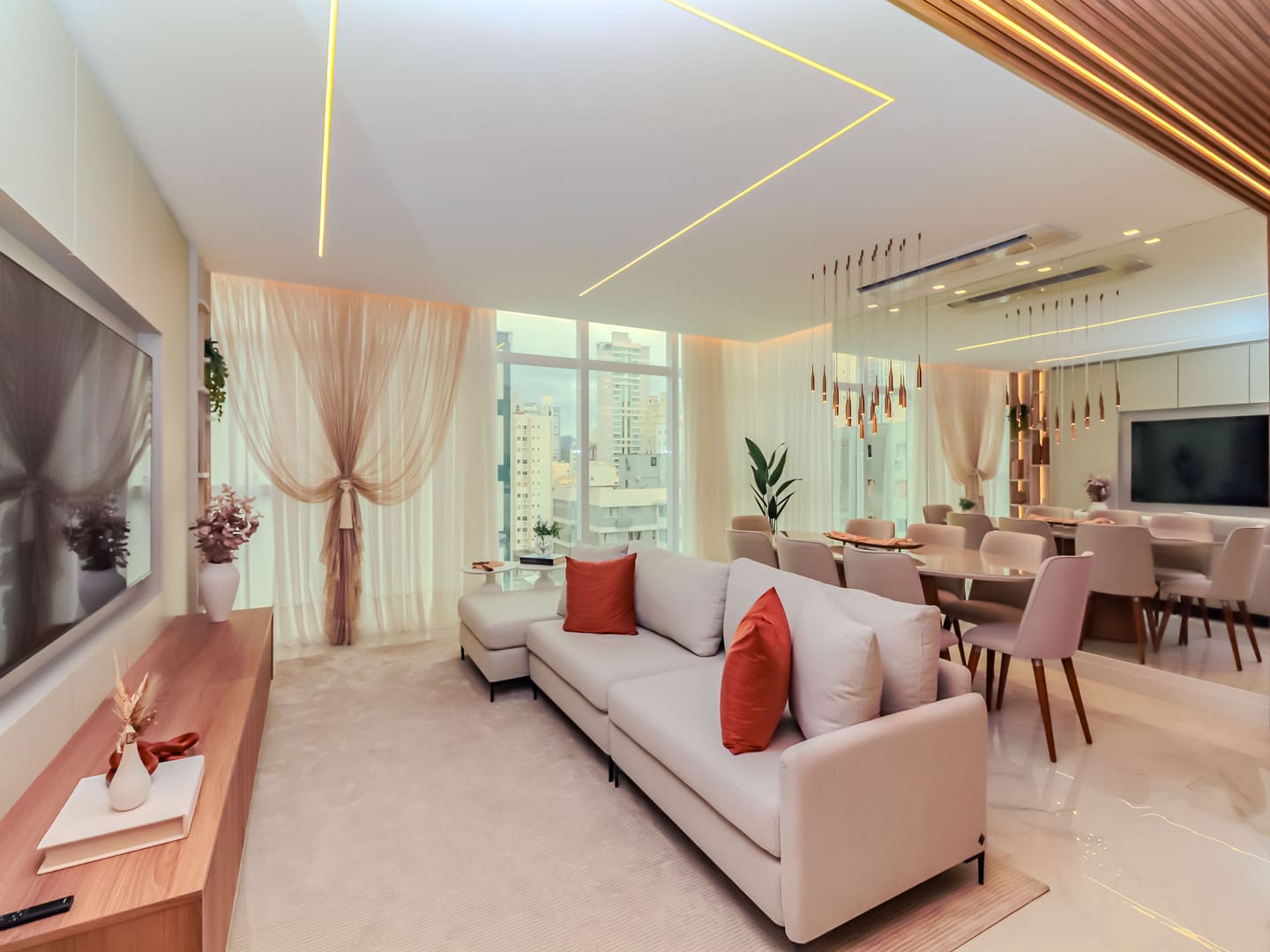 No Edifício Horizon Residence, encontra-se um apartamento mobiliado de 142 m² de área privativa, que revela a maturidade de um projeto arquitetônico atento às necessidades reais do morador. São duas suítes bem distribuídas, dois dormitórios, três vagas de garagem e uma planta inteligente que privilegia amplitude, iluminação natural e circulação fluida. Os acabamentos são de alto padrão, há infraestrutura para automação, churrasqueira americana e forro de gesso em todos os ambientes — detalhes que, combinados, imprimem sofisticação sem excessos.