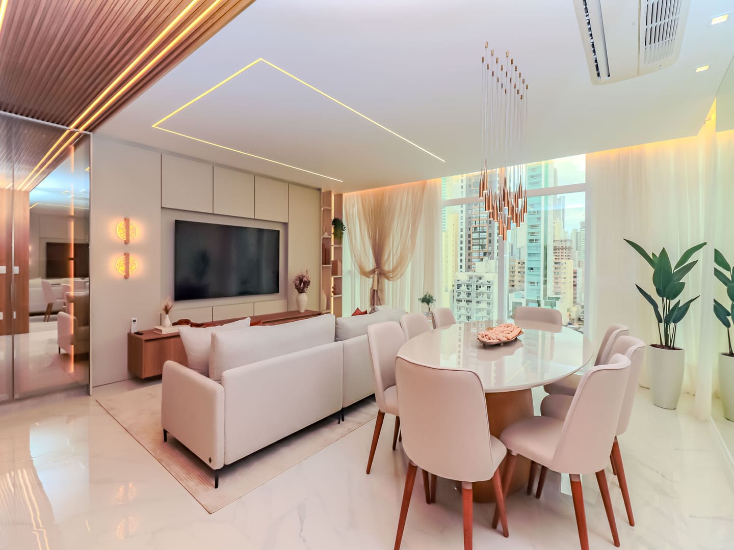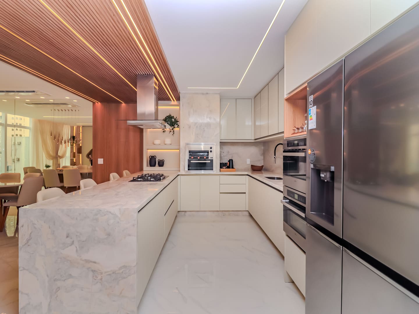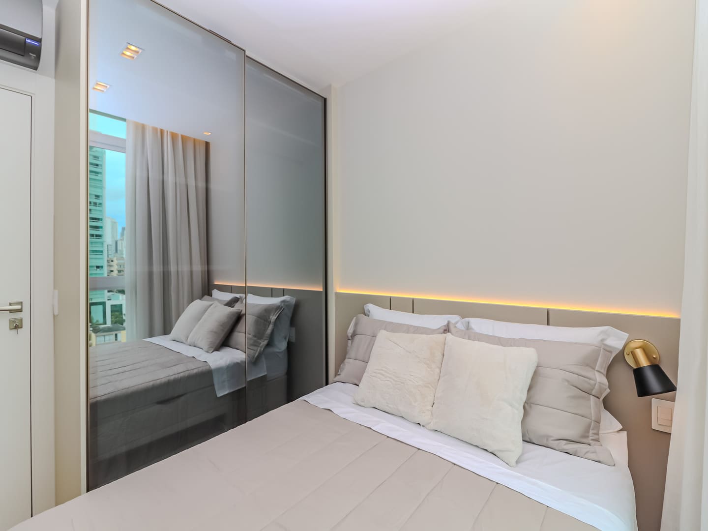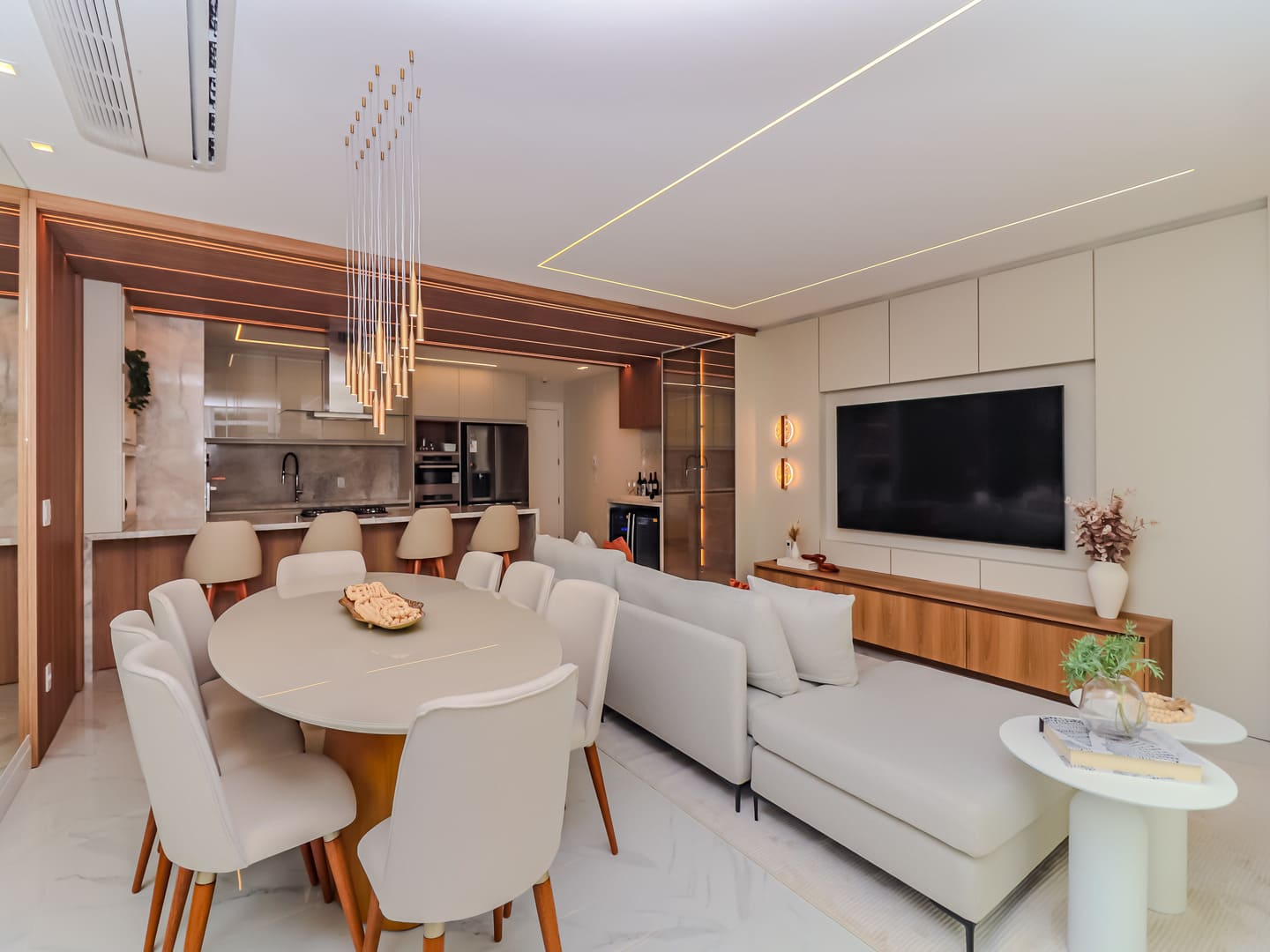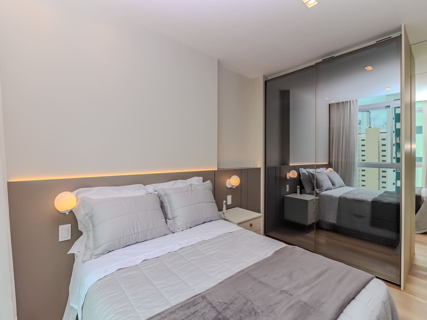 No Edifício Horizon Residence, encontra-se um apartamento mobiliado de 142 m² de área privativa, que revela a maturidade de um projeto arquitetônico atento às necessidades reais do morador. São duas suítes bem distribuídas, dois dormitórios, três vagas de garagem e uma planta inteligente que privilegia amplitude, iluminação natural e circulação fluida. Os acabamentos são de alto padrão, há infraestrutura para automação, churrasqueira americana e forro de gesso em todos os ambientes — detalhes que, combinados, imprimem sofisticação sem excessos.