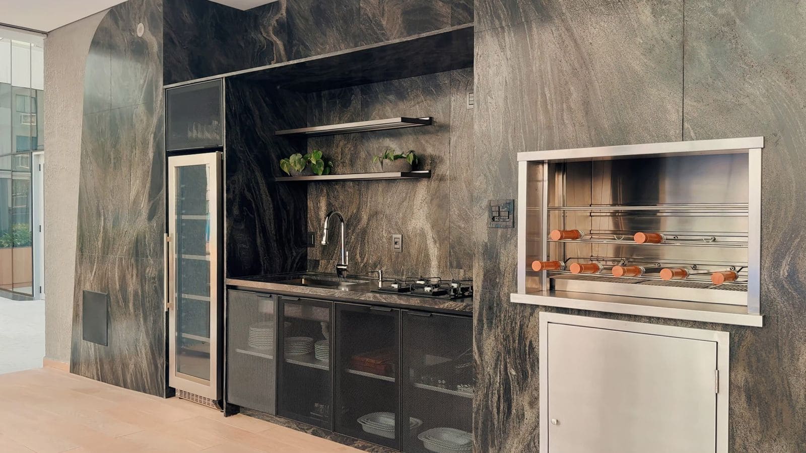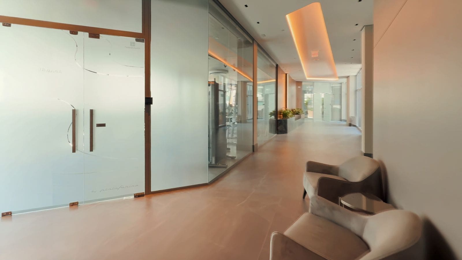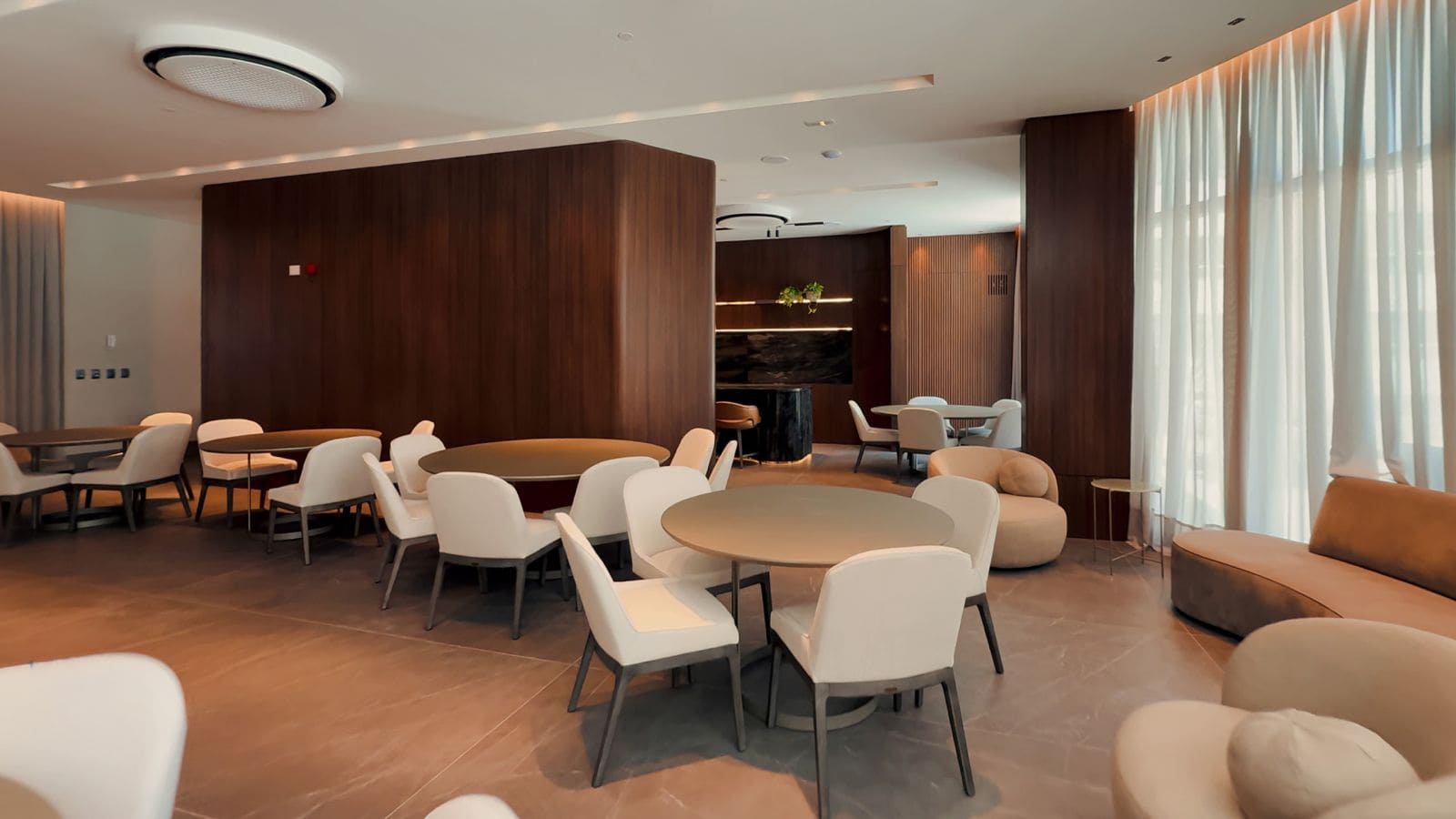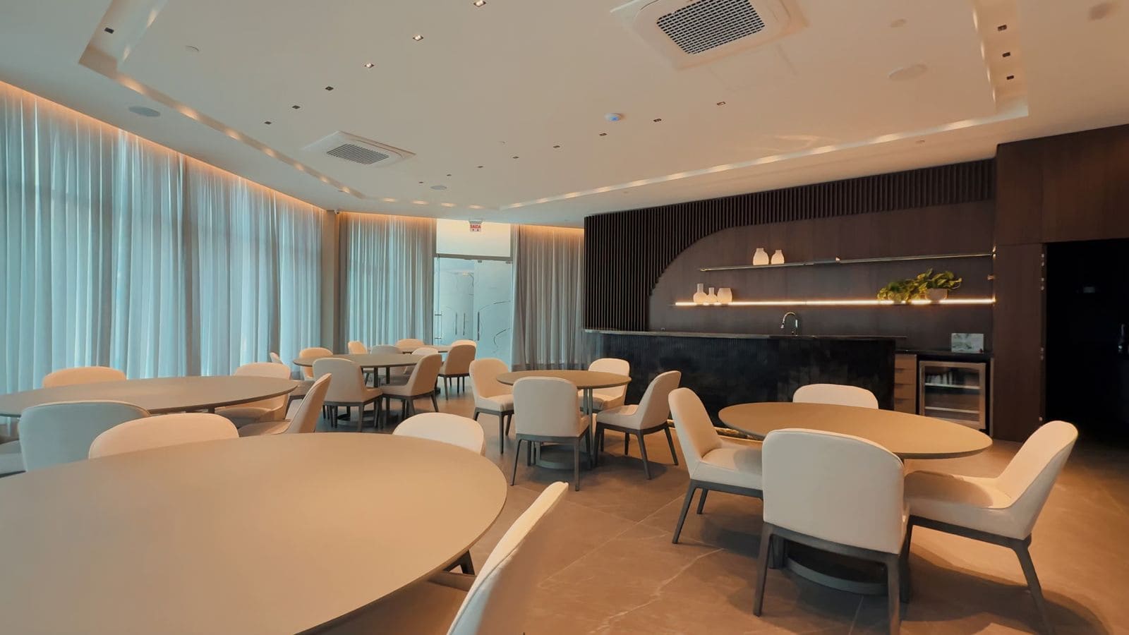 O empreendimento, por sua vez, sustenta essa entrega com coerência. São 62 pavimentos e 100 apartamentos, fachada em pele de vidro e áreas comuns desenhadas com o mesmo rigor conceitual. O hall com lounge climatizado, os três elevadores de alta velocidade e o gerador para áreas comuns reforçam a operação segura e funcional do edifício.