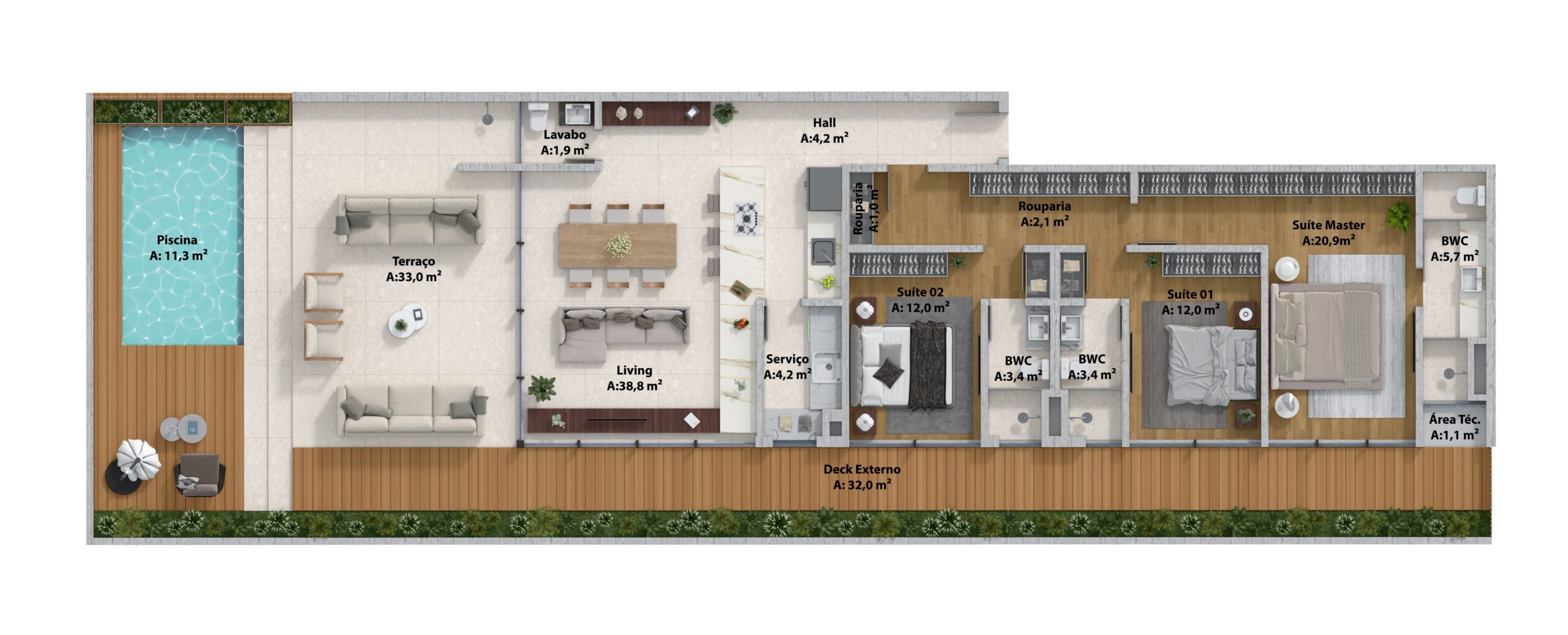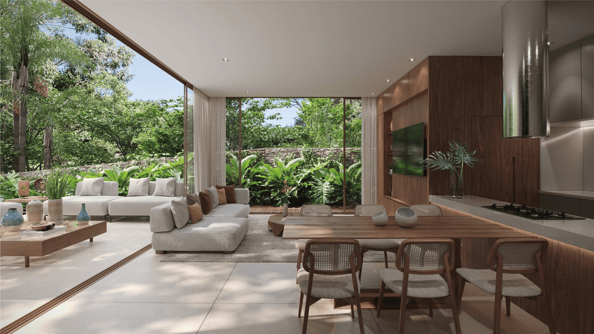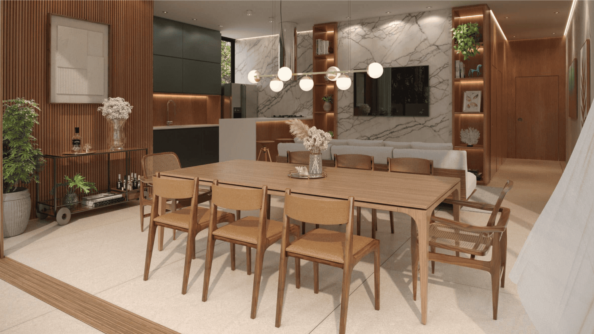 As áreas sociais do apartamento unem estética e praticidade: o amplo living conecta sala de estar, jantar e varanda em um único fluxo visual. A varanda gourmet, com churrasqueira e vista panorâmica, é o espaço ideal para desfrutar o entorno preservado da Estaleiro com discrição e conforto.
