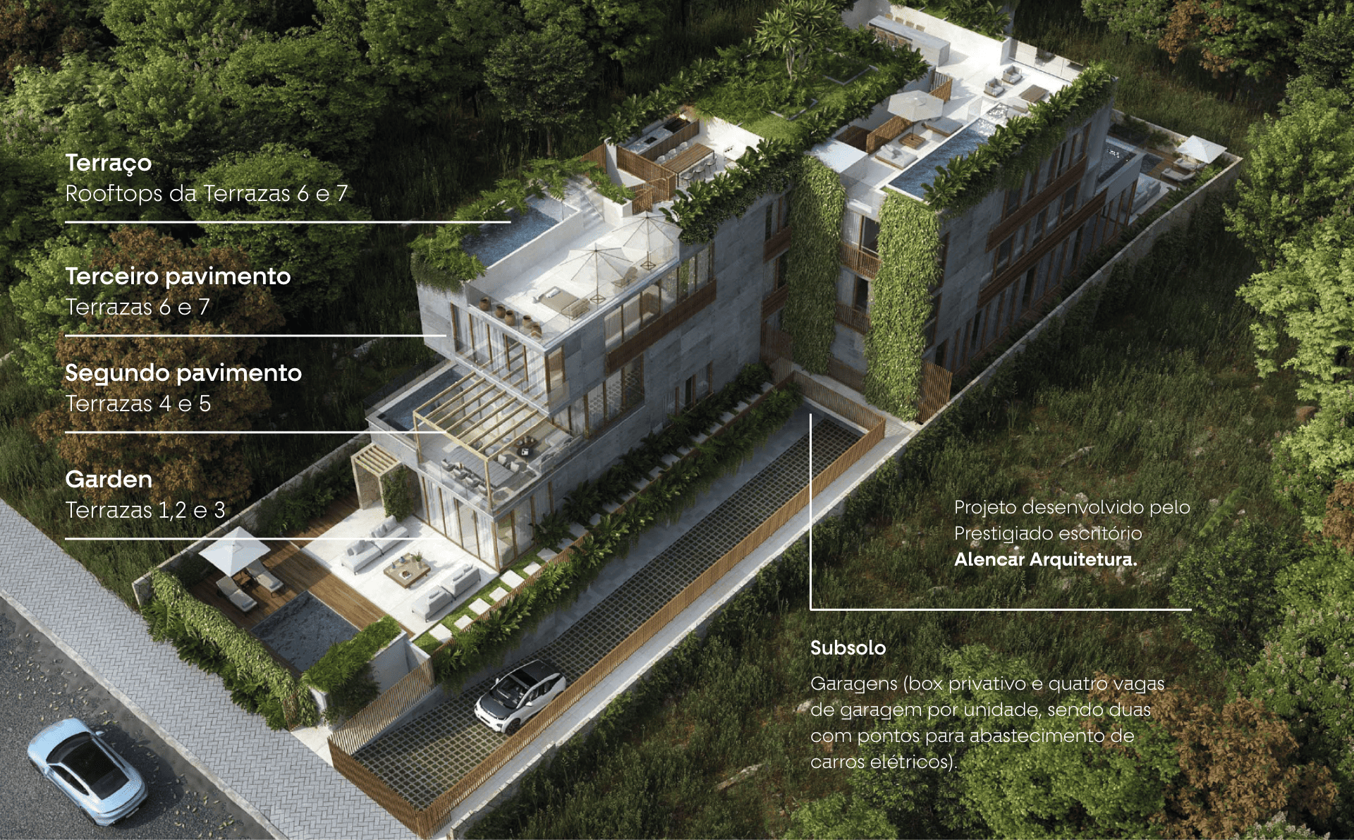 O Edifício AYA Terrazas do Porto reflete a harmonia entre design e paisagem. Sua arquitetura adota linhas puras e materiais naturais que dialogam com a mata e o mar. Cada terraza conta com piscina aquecida exclusiva, e as unidades superiores oferecem rooftops privativos. O empreendimento inclui garagem com três vagas e box privativo, além de pontos para abastecimento de carros elétricos.