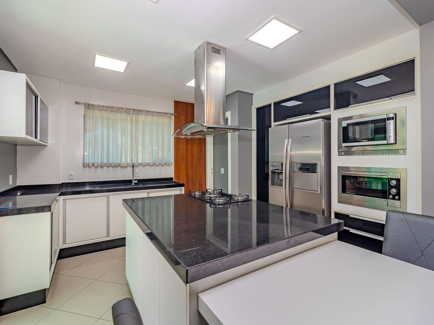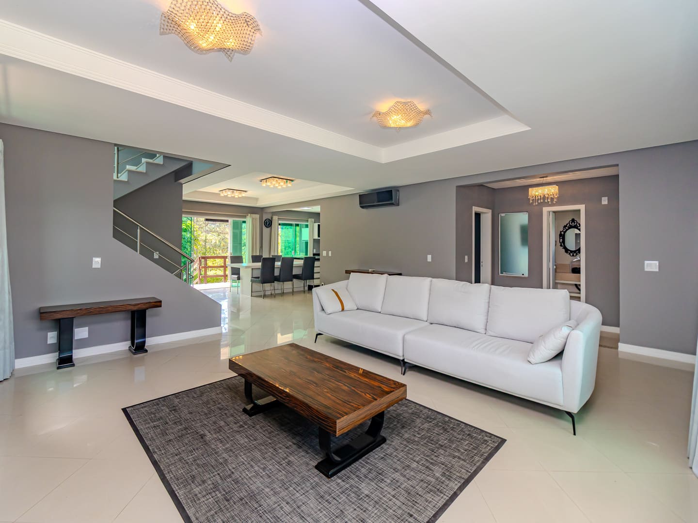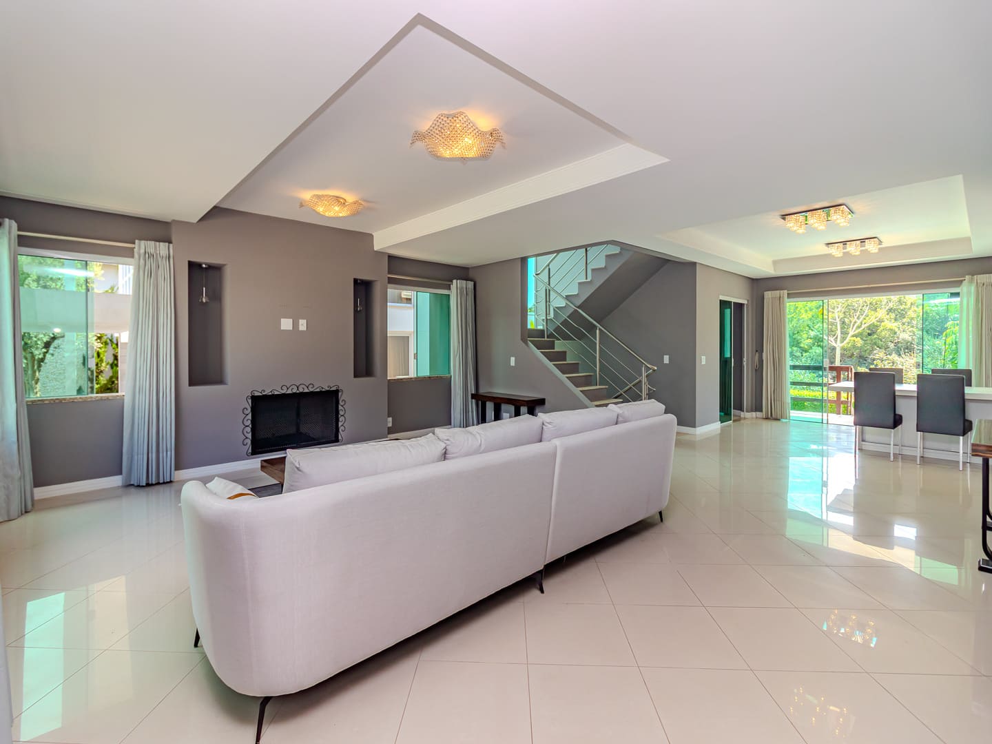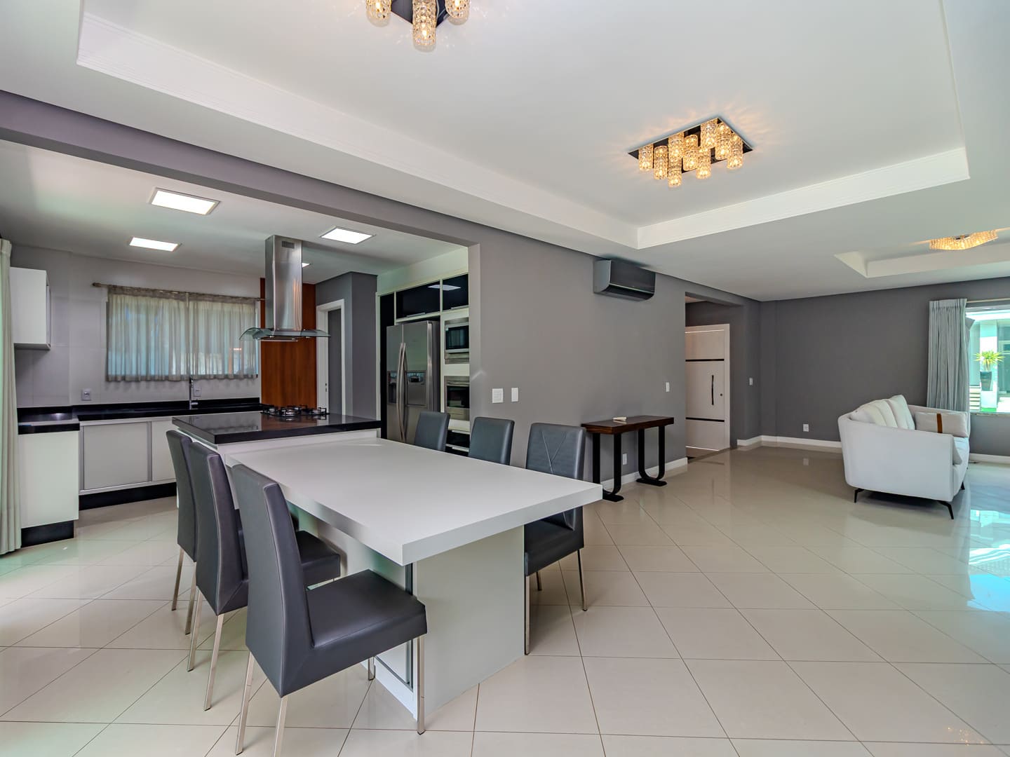 O projeto valoriza amplitude e integração. O living com pé-direito duplo é marcado pela escada em vidro iluminada em LED, criando impacto visual e fluidez. A cozinha gourmet, equipada com eletrodomésticos de ponta e adega climatizada, conecta-se naturalmente à sala de jantar, formando um cenário perfeito para experiências gastronômicas e momentos de convivência.