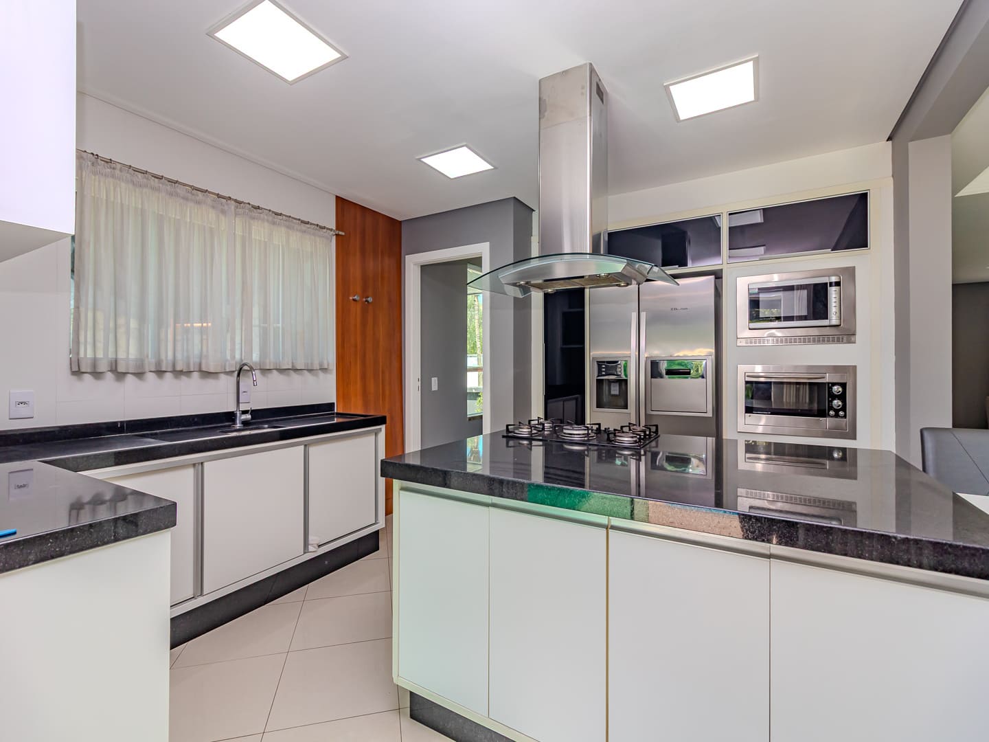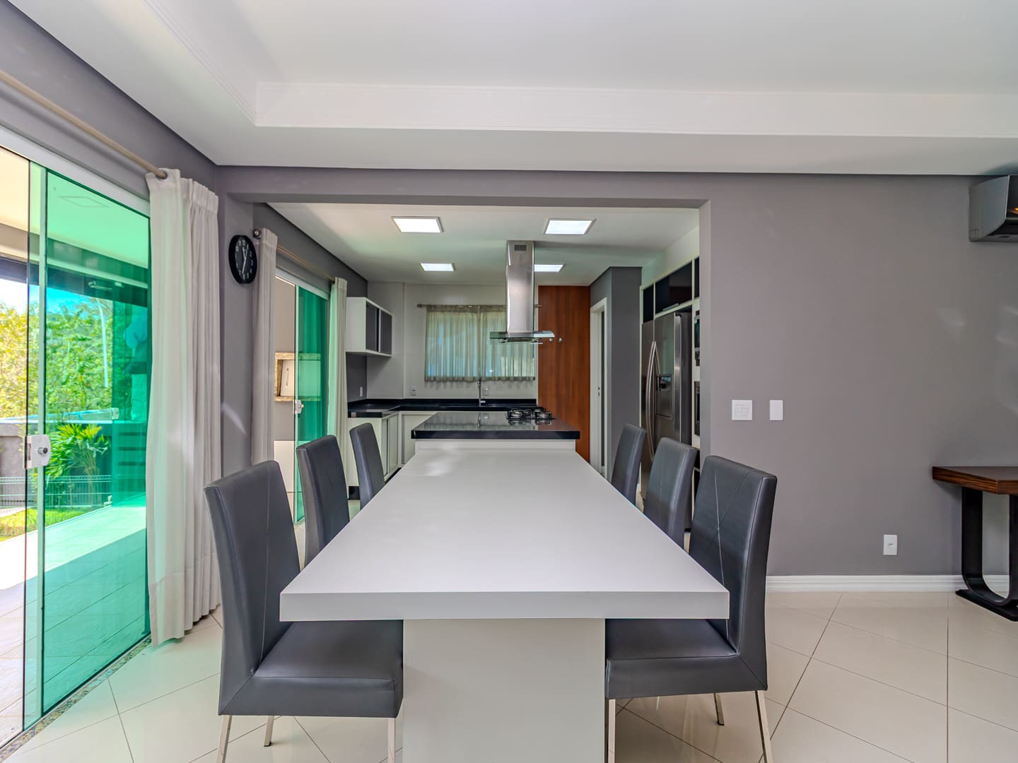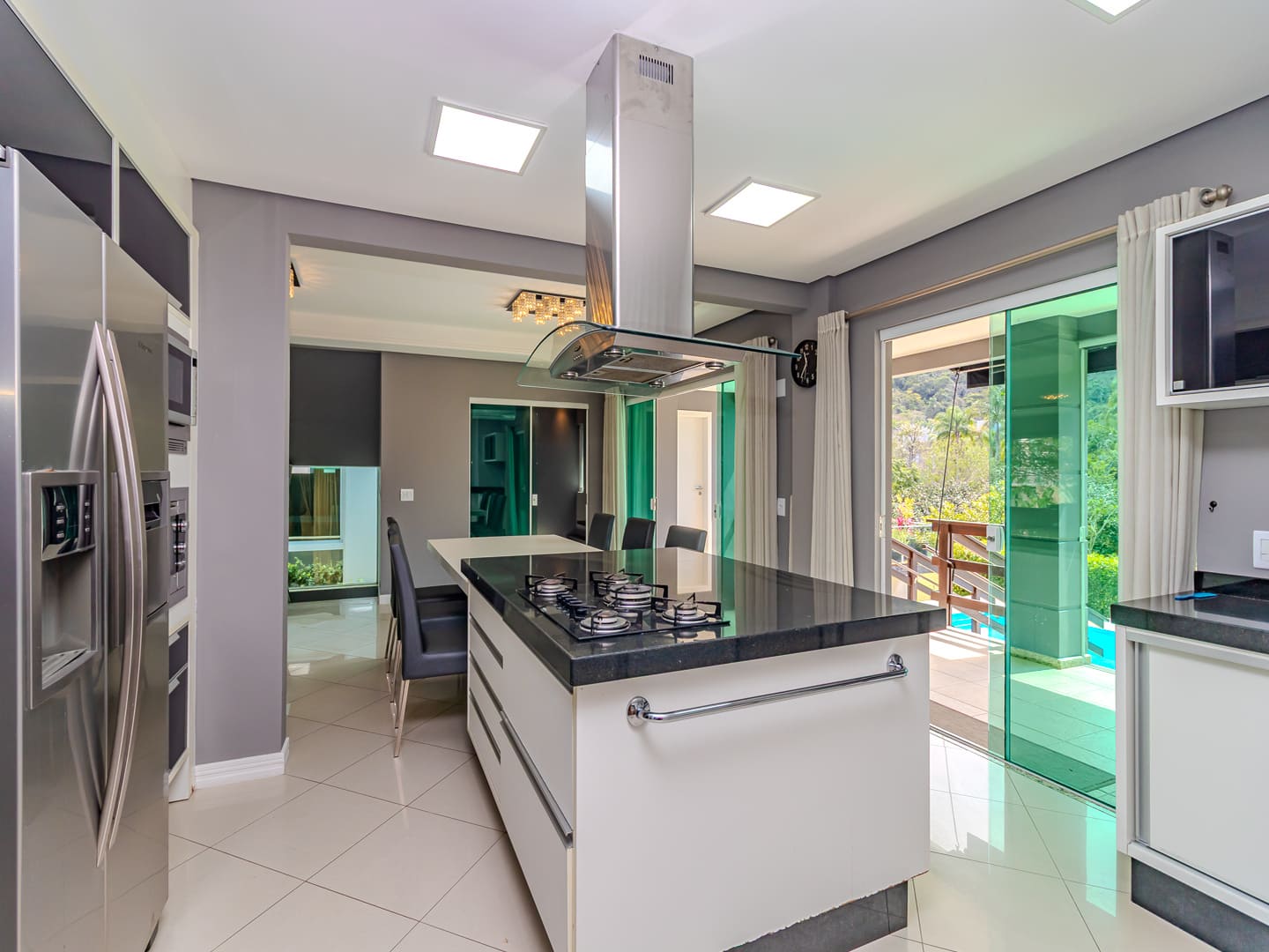 O projeto valoriza amplitude e integração. O living com pé-direito duplo é marcado pela escada em vidro iluminada em LED, criando impacto visual e fluidez. A cozinha gourmet, equipada com eletrodomésticos de ponta e adega climatizada, conecta-se naturalmente à sala de jantar, formando um cenário perfeito para experiências gastronômicas e momentos de convivência.