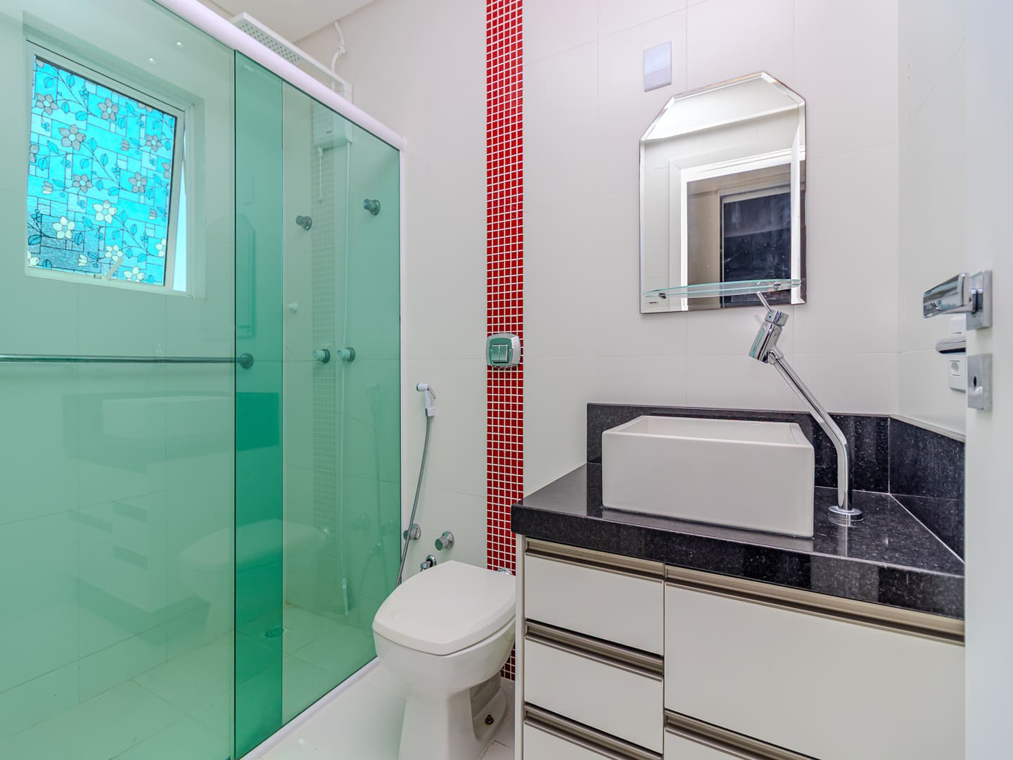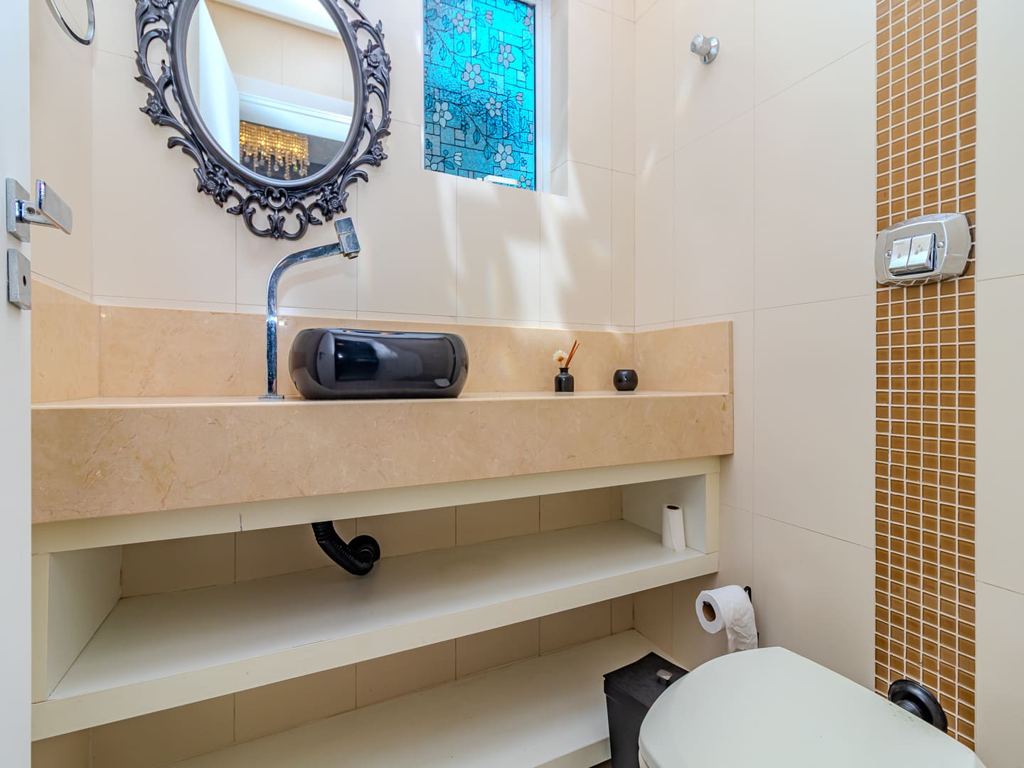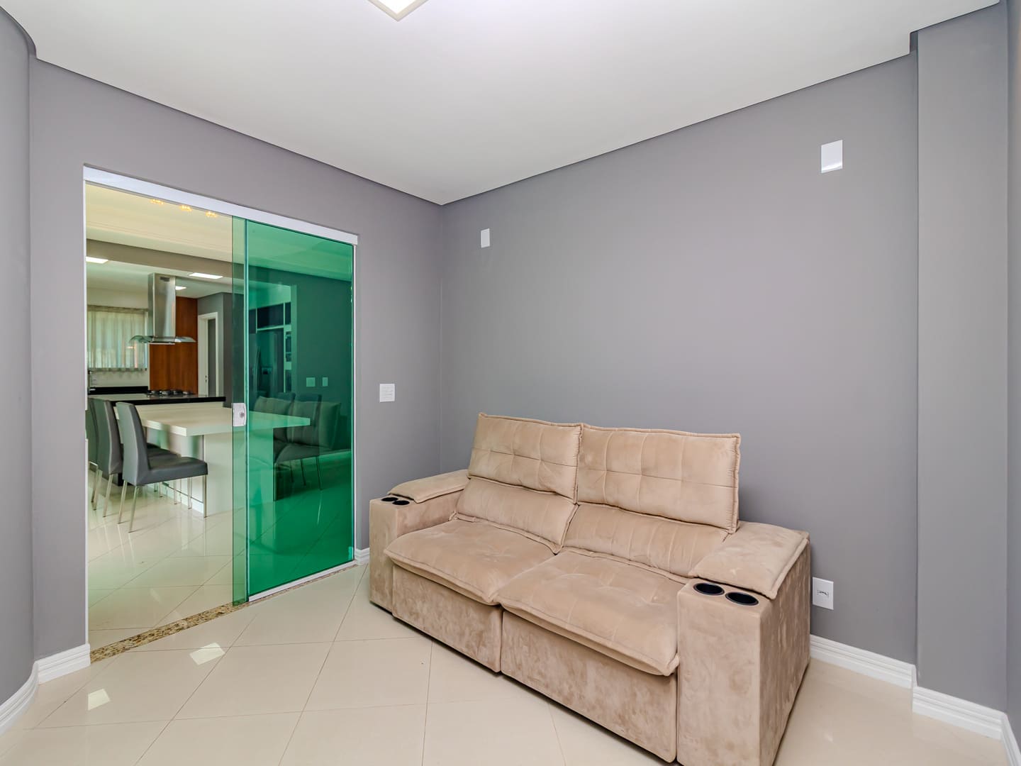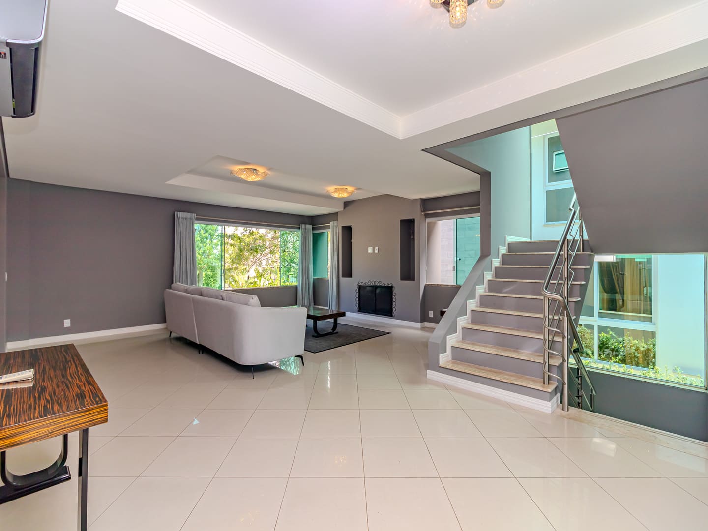 O projeto valoriza amplitude e integração. O living com pé-direito duplo é marcado pela escada em vidro iluminada em LED, criando impacto visual e fluidez. A cozinha gourmet, equipada com eletrodomésticos de ponta e adega climatizada, conecta-se naturalmente à sala de jantar, formando um cenário perfeito para experiências gastronômicas e momentos de convivência.