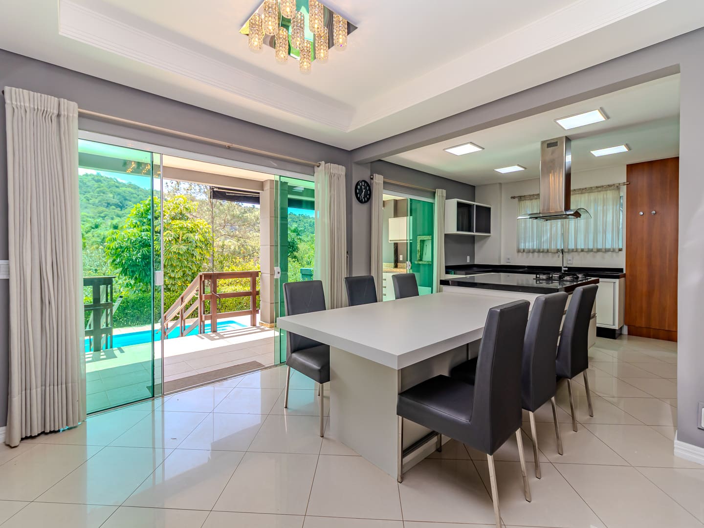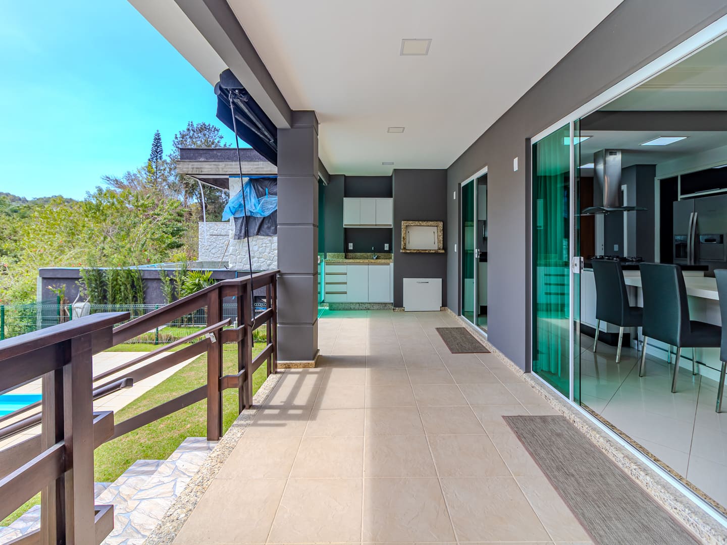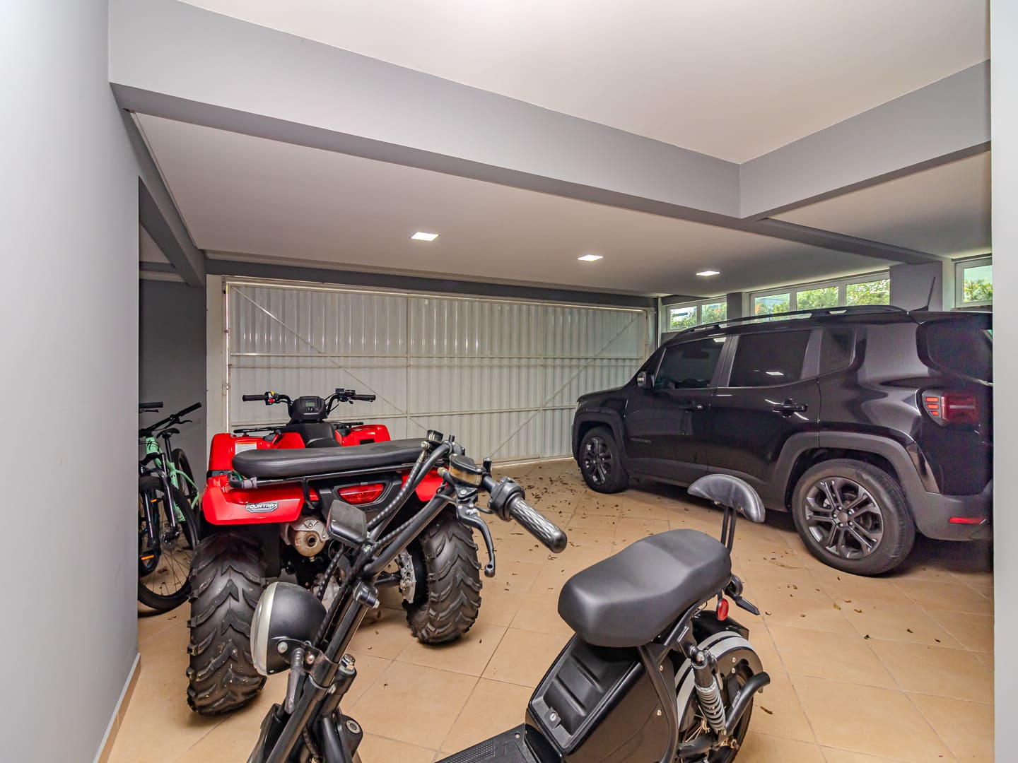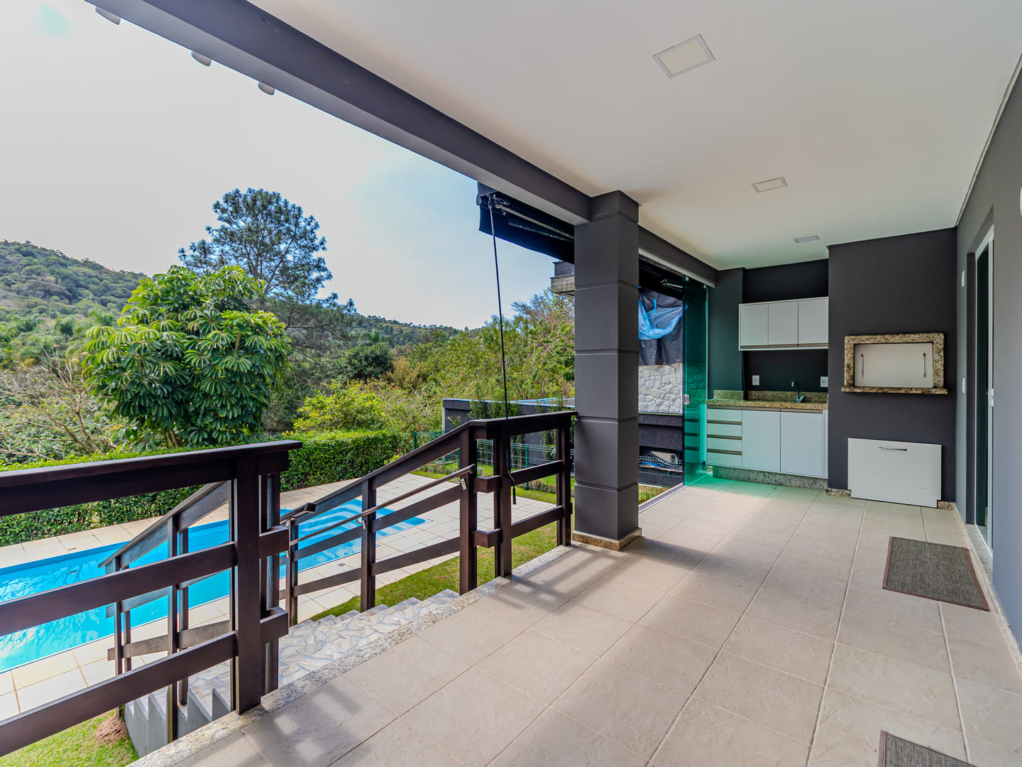 A área externa foi desenhada para lazer e relaxamento: piscina aquecida com bar molhado, spa com cascata e lounge coberto por pergolado criam um ambiente ideal para receber ou simplesmente contemplar a tranquilidade ao redor. No subsolo, um pub privativo, suíte para hóspedes, garagem para até quatro carros (mais dois na rampa externa) e portão acústico elevam ainda mais o padrão de exclusividade.