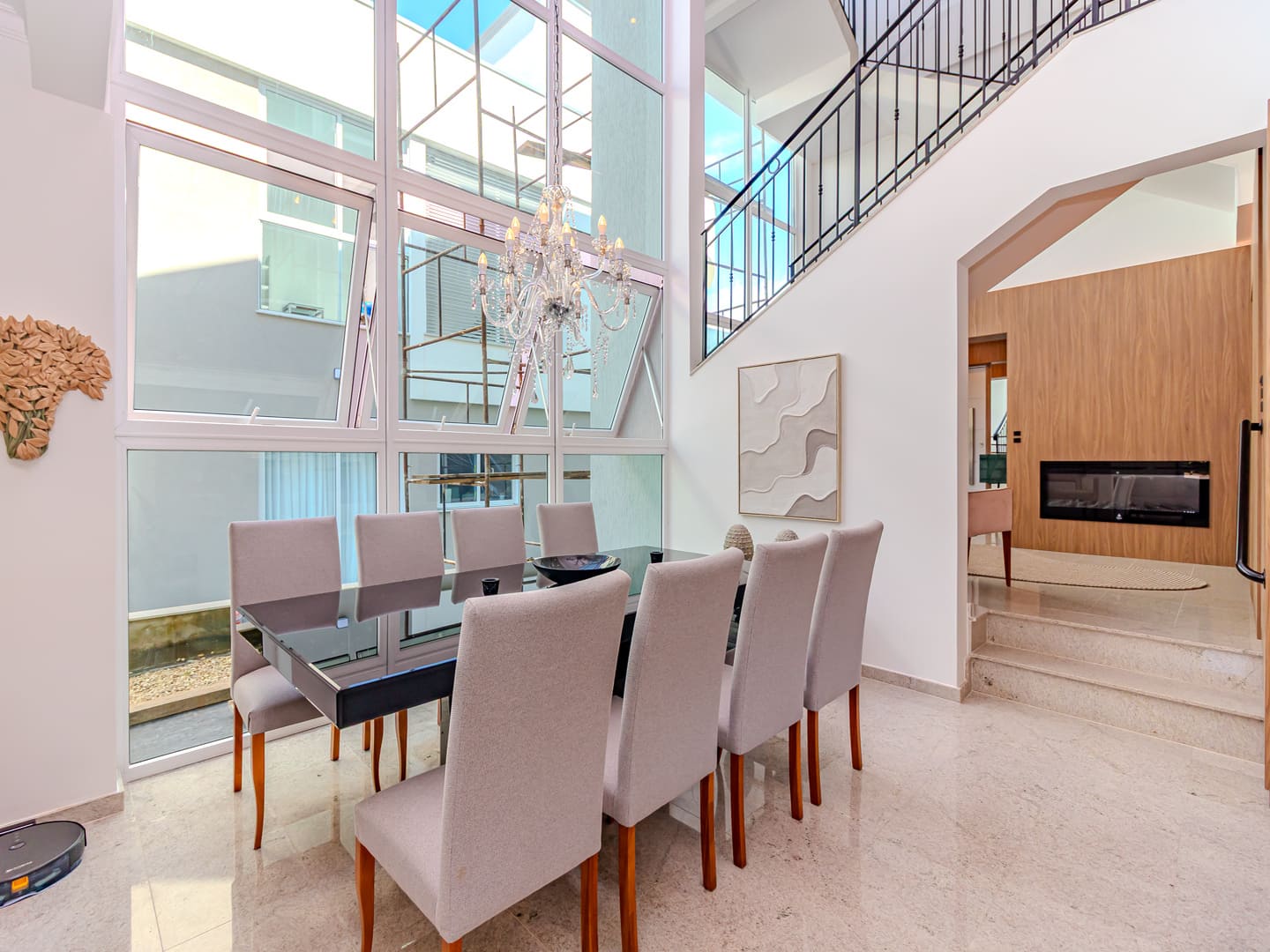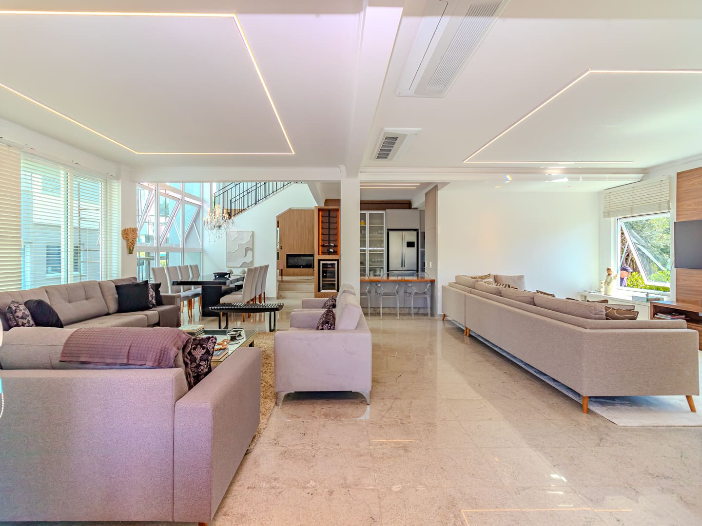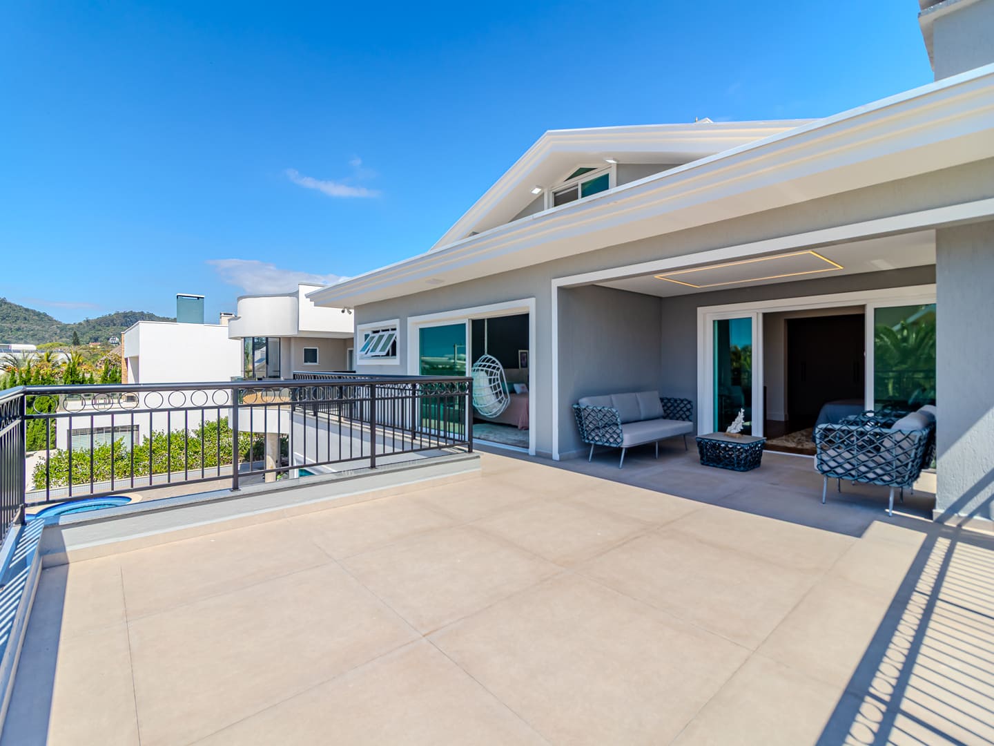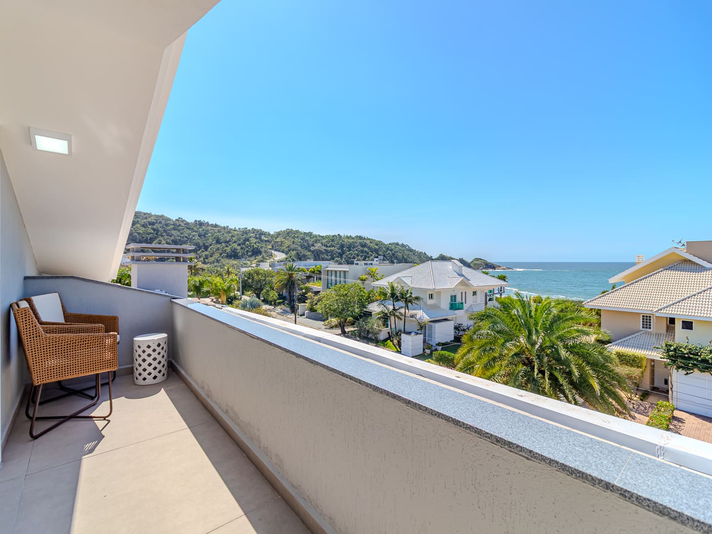 Com 610 m² de área construída distribuídos em três pavimentos, esta residência no Condomínio Vivendas do Atlântico entrega uma proposta sólida de conforto, eficiência e localização estratégica. Com projeto inteligente e já totalmente mobiliada e equipada, a casa reúne cinco suítes, incluindo uma suíte master com vista para o mar — elemento que reforça a conexão visual com o entorno natural da Praia do Estaleiro.