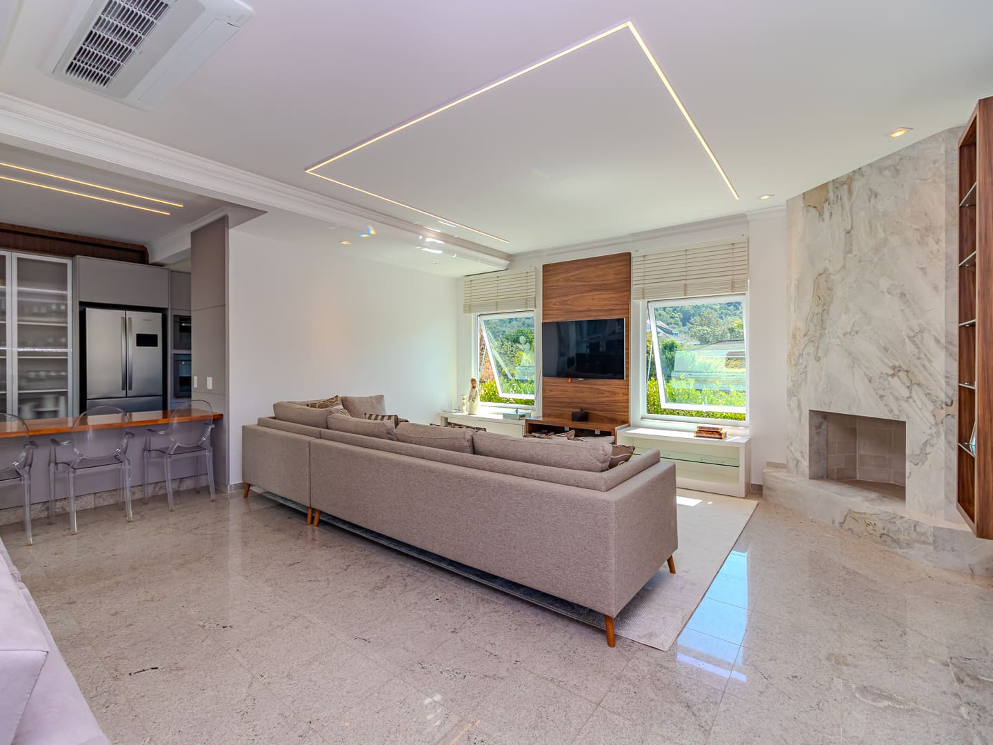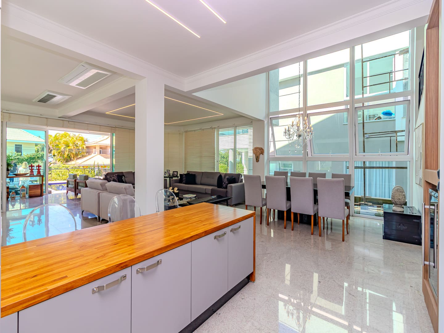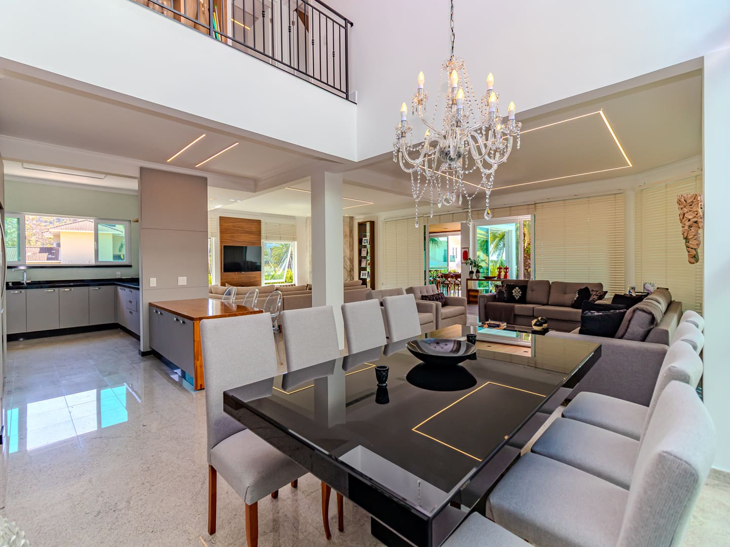 O layout foi desenhado para proporcionar uma vivência fluida: o living é integrado e distribui, de maneira harmoniosa, sala de estar, jantar e TV em um ambiente contínuo, que se estende até a cozinha planejada. A área gourmet com churrasqueira a carvão agrega valor social ao imóvel, favorecendo recepções e momentos descontraídos com vista para a área externa. Lavabo, lavanderia e garagem com duas vagas completam os espaços funcionais.
