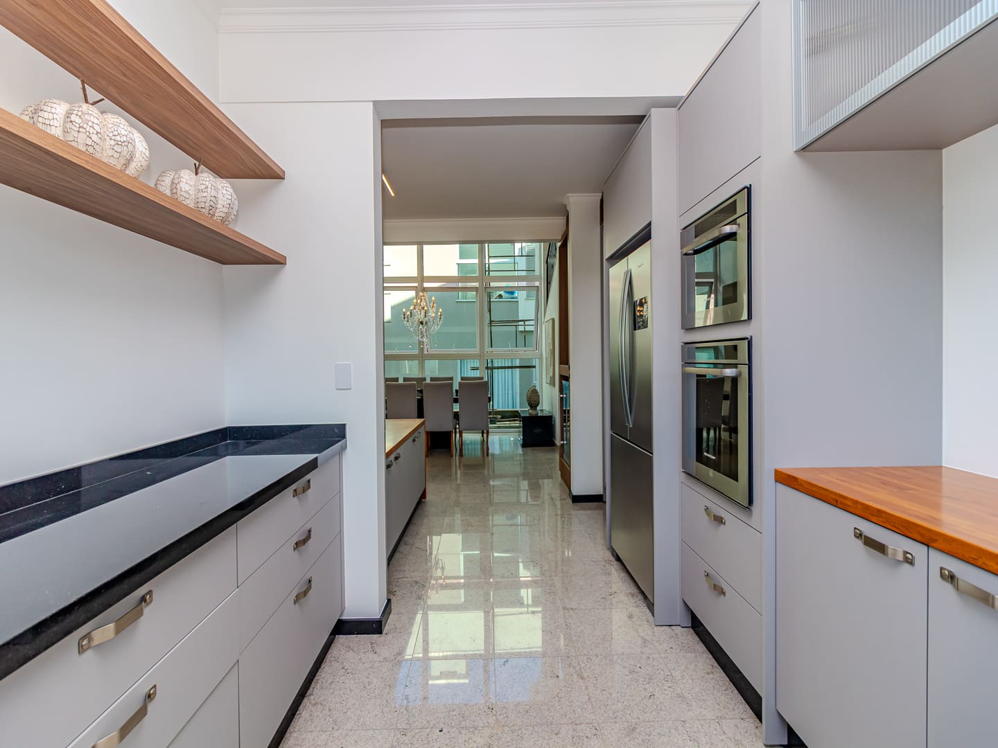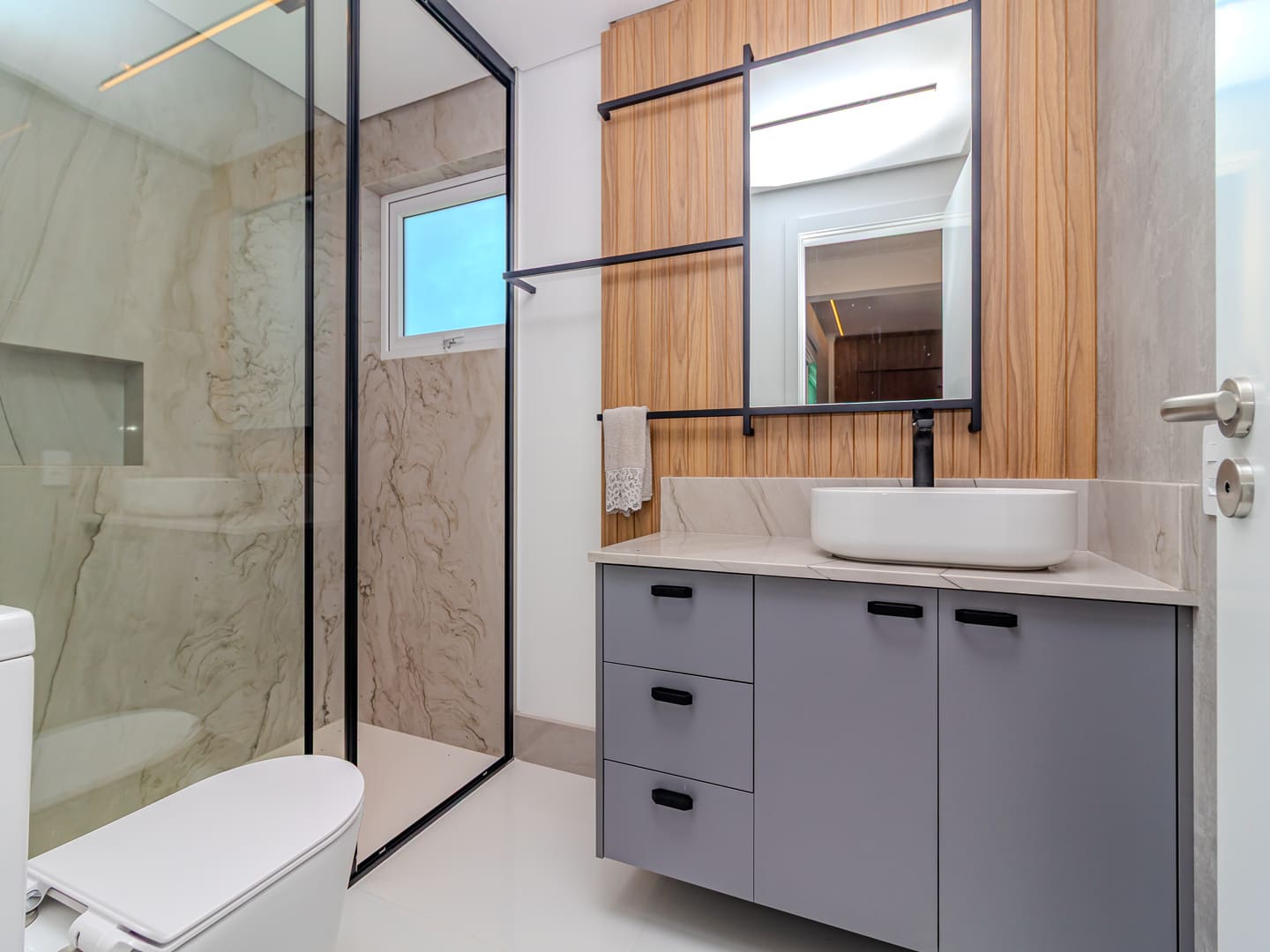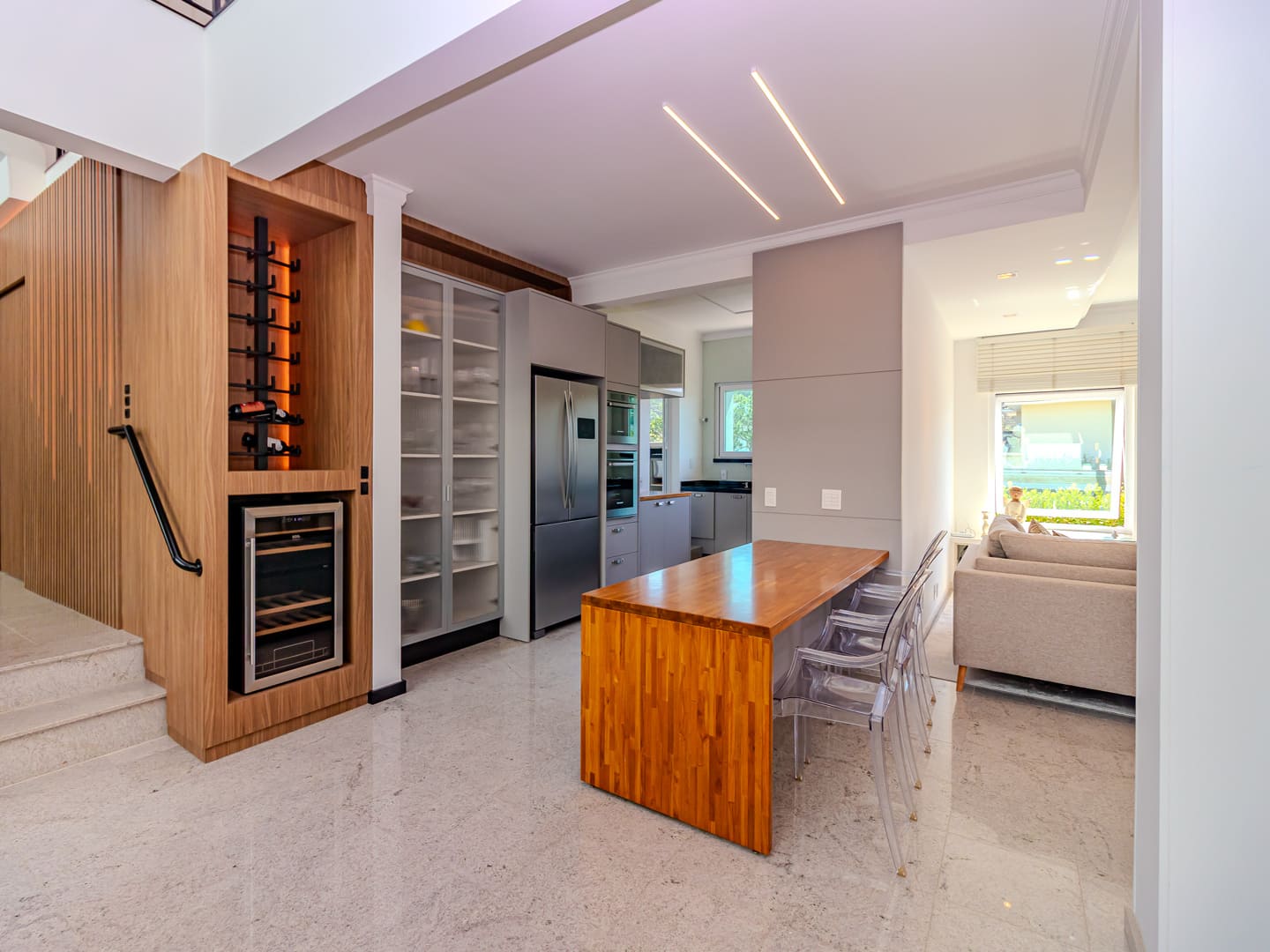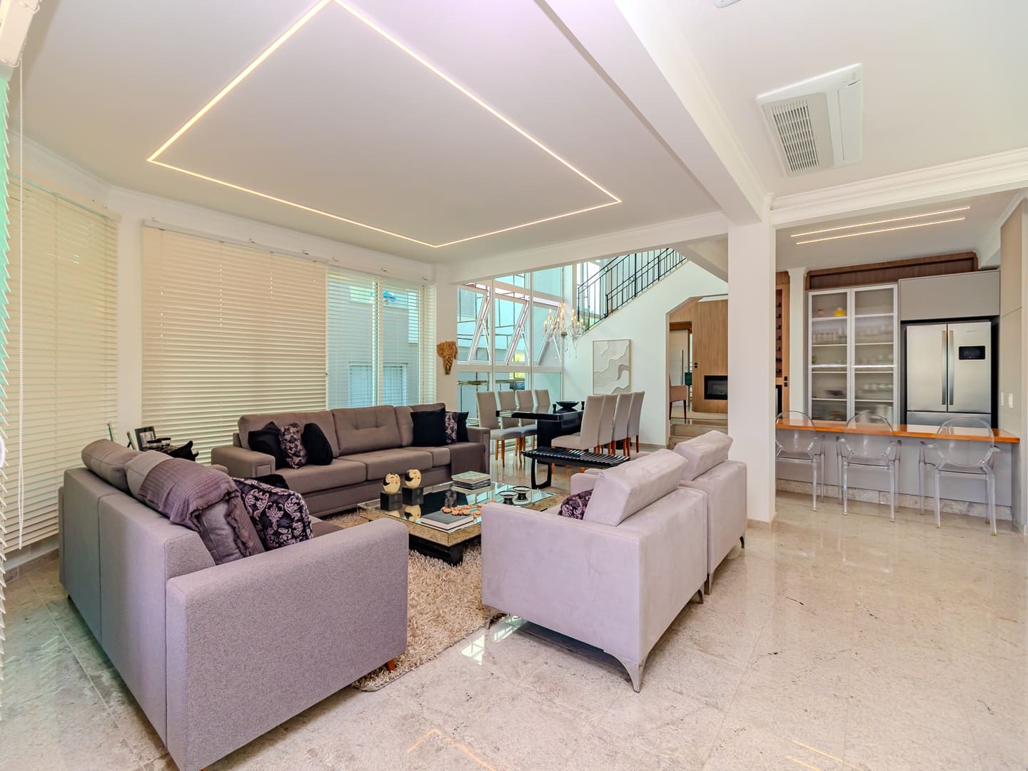 O layout foi desenhado para proporcionar uma vivência fluida: o living é integrado e distribui, de maneira harmoniosa, sala de estar, jantar e TV em um ambiente contínuo, que se estende até a cozinha planejada. A área gourmet com churrasqueira a carvão agrega valor social ao imóvel, favorecendo recepções e momentos descontraídos com vista para a área externa. Lavabo, lavanderia e garagem com duas vagas completam os espaços funcionais.