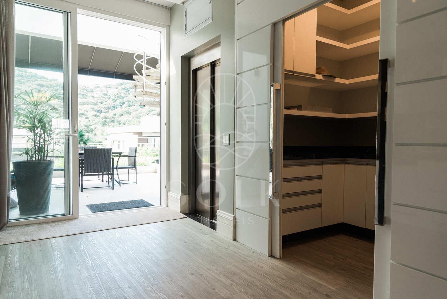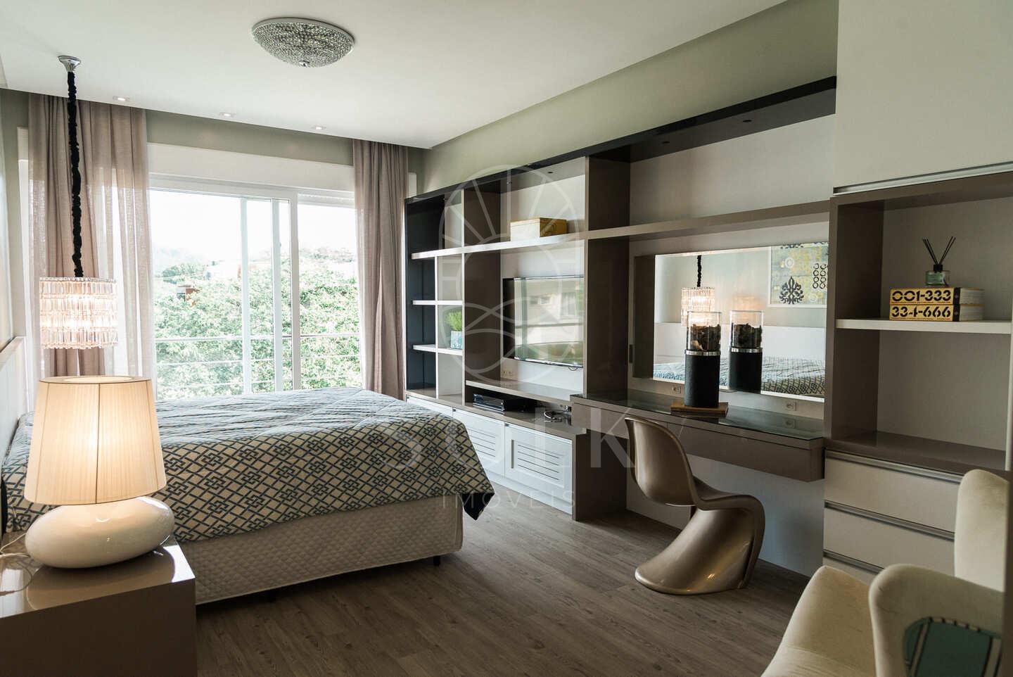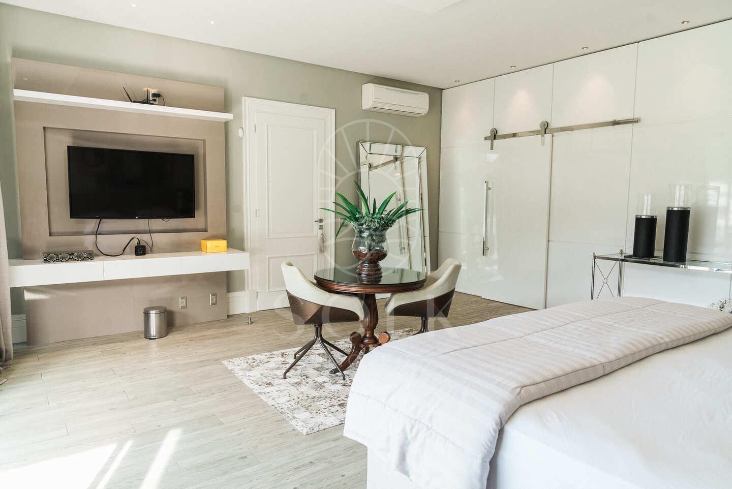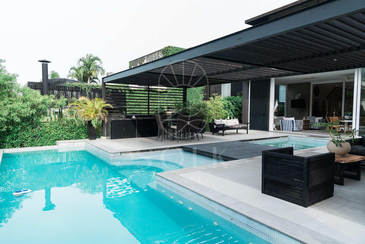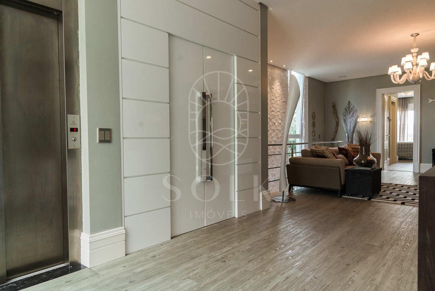 Destaque para o elevador privativo e para o sistema de energia solar, reforçando a eficiência e acessibilidade do imóvel. A piscina com prainha e deck retrátil compõe o cenário externo, pensado para relaxamento com funcionalidade. A lareira — tanto elétrica quanto a gás — proporciona conforto térmico nos dias mais amenos. Lavanderia e garagem com capacidade para até cinco veículos completam a estrutura.