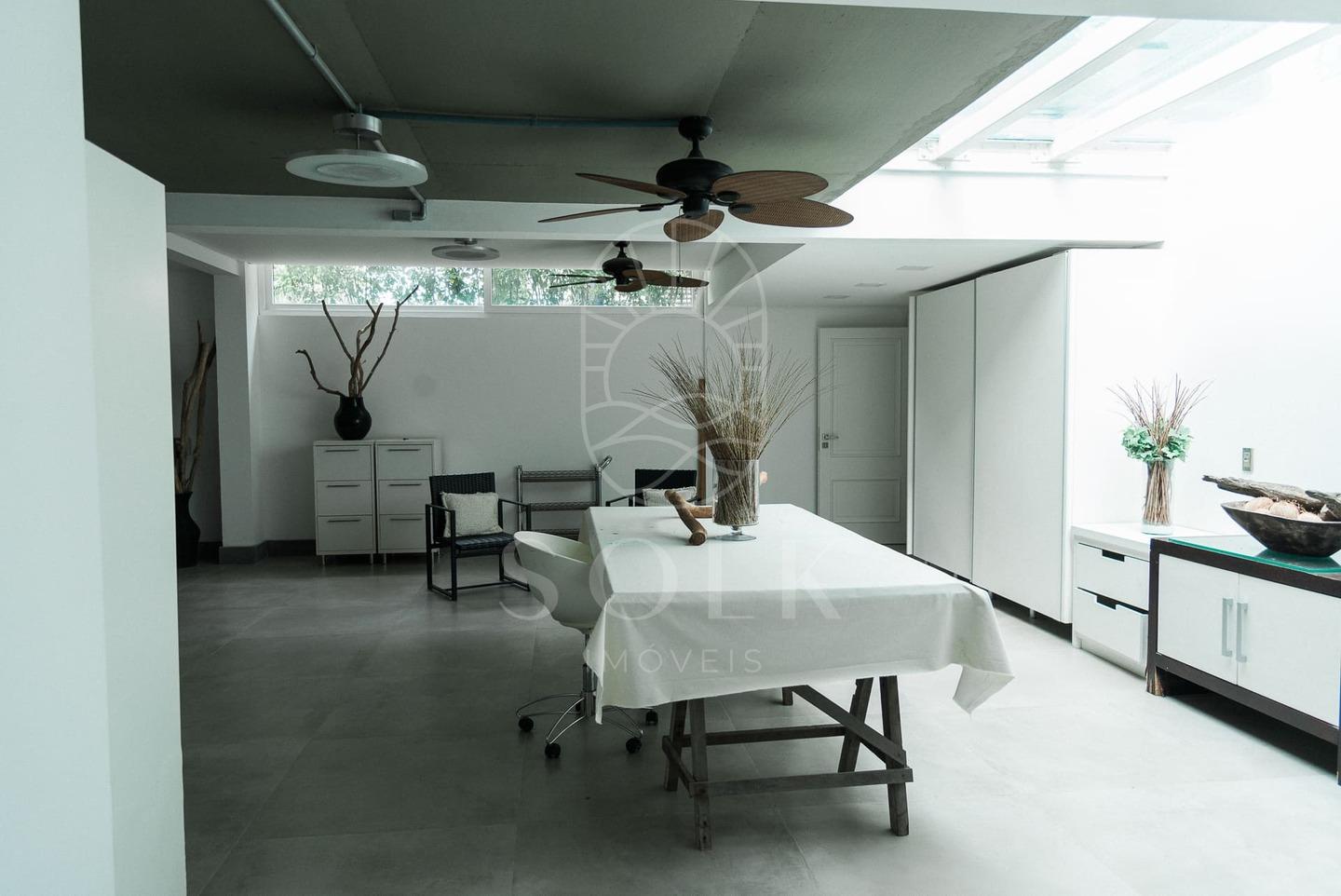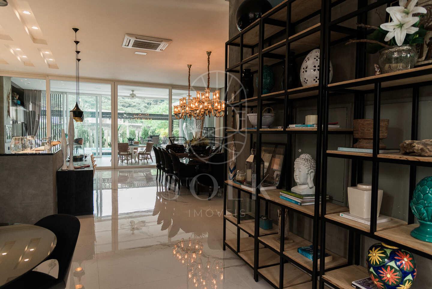 São três suítes no total — incluindo uma suíte master com closet amplo e acesso à varanda, além de suíte para hóspedes e outra de apoio. Um escritório isolado, atelier e uma despensa complementam os ambientes de suporte. As salas são integradas, com estar, jantar e cinema articuladas em eixos bem definidos. O espaço gourmet, com bar e churrasqueira, convida a experiências gastronômicas completas, e se conecta a varandas que revelam uma vista marcante da vegetação nativa.