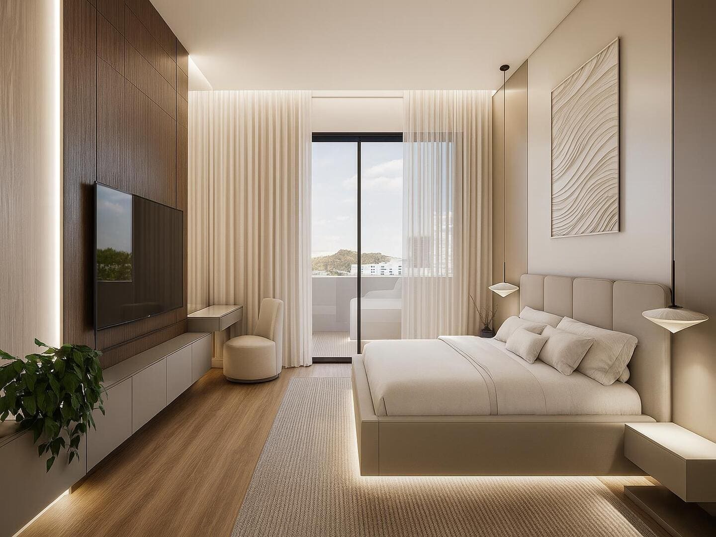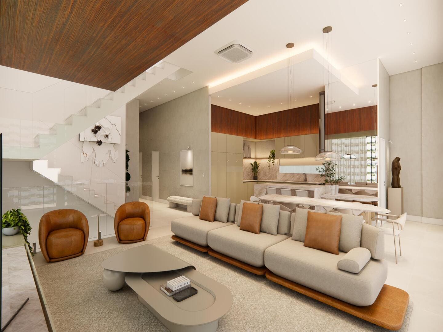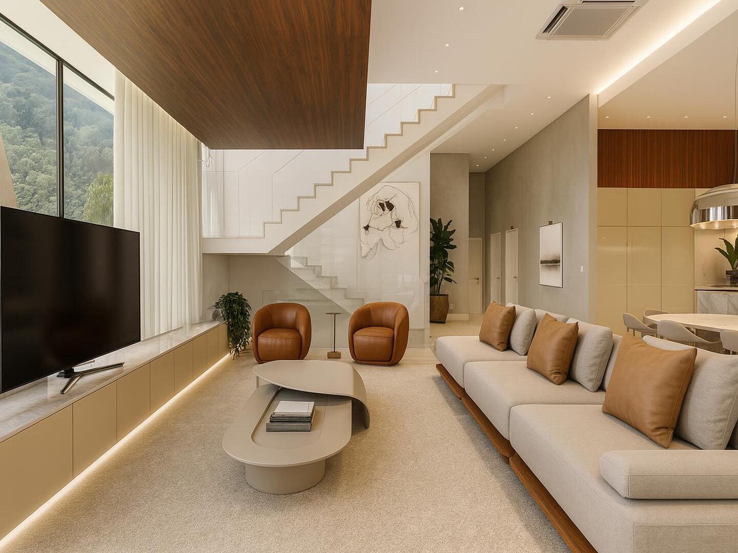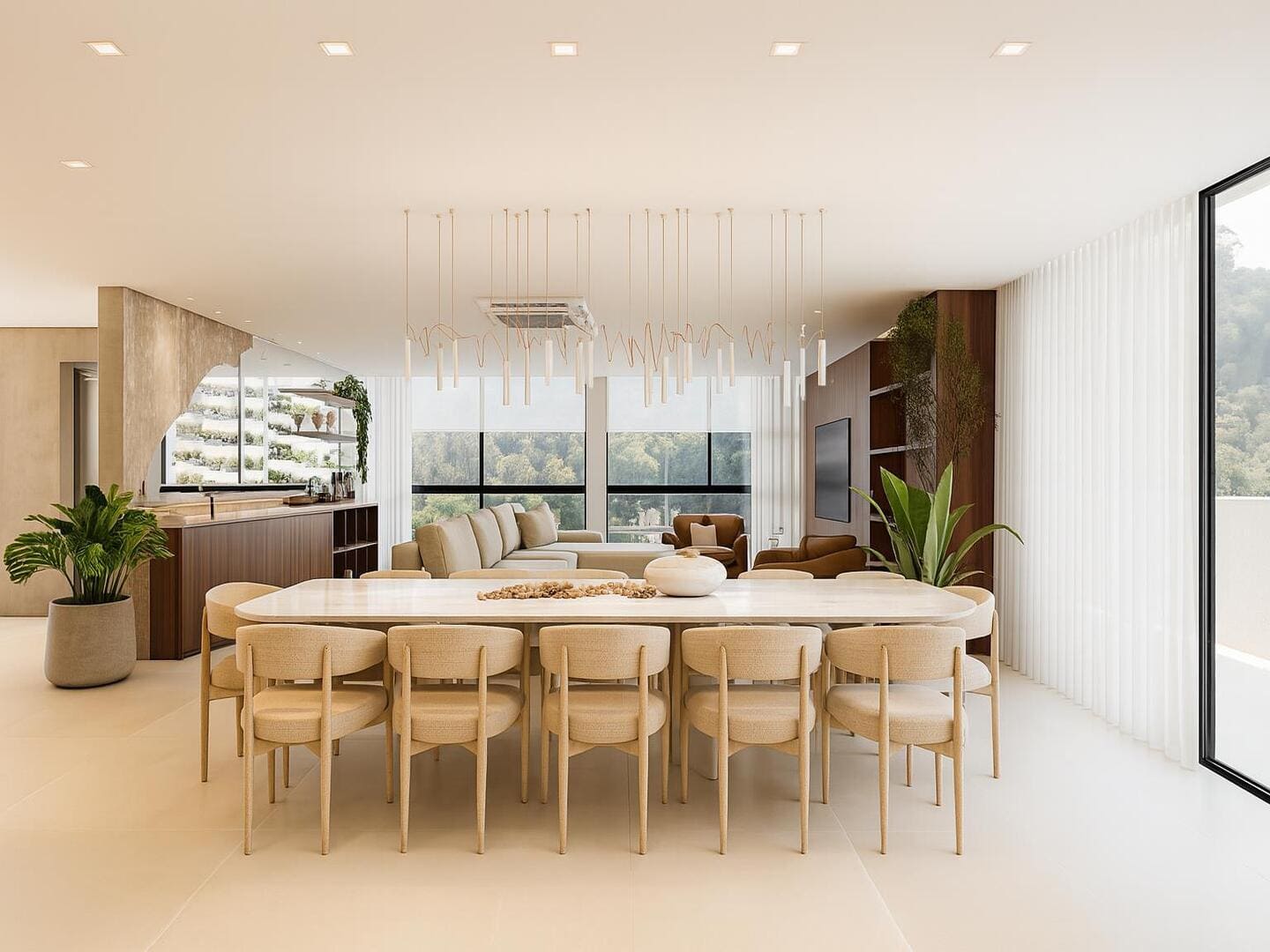 A residência foi concebida para proporcionar conforto em escala generosa. São quatro suítes, incluindo uma master com closet e banheira, além de ambientes integrados que favorecem o convívio sem abrir mão da individualidade. O living, em conceito aberto, conecta-se à área gourmet e à piscina aquecida com borda voltada ao horizonte — um convite permanente à contemplação. O projeto de interiores, executado conforme as imagens, traduz uma linguagem limpa, com materiais naturais, iluminação estratégica e mobiliário que equilibra sofisticação e funcionalidade.